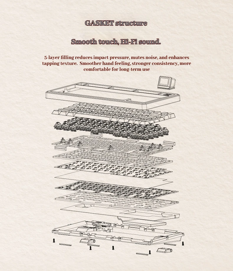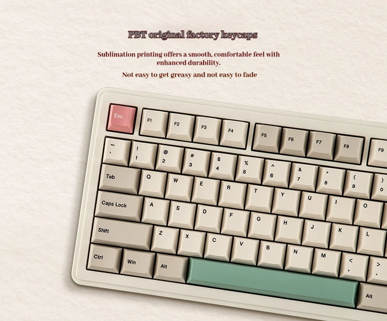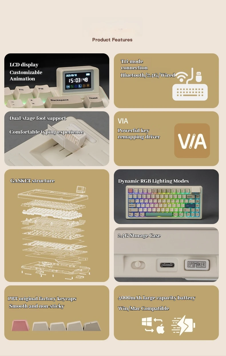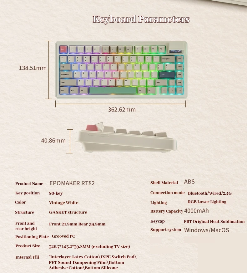 Nombre del producto: EPOMAKERRT82 Material de la carcasa: ABS Posición clave: 80 teclas Modo de conexión: Bluetooth/con cable/2.4G Color: Blanco Retro Estructura: Estructura GASKET Capacidad de la batería: 4000 mAh Altura de adelante hacia atrás: 21,8 mm delante y 39,8 mm detrás Teclas: sublimación térmica de fábrica PBT Tablero de posicionamiento: PC ranurado Sistemas compatibles: Windows/Macos Tamaño del producto: 326,7 * 143,2 * 39,8 mm (excluyendo el tamaño del televisor) Iluminación: RGB.Posición de luz más baja Relleno interno: "Algodón de látex laminado, almohadilla de eje XPE, película acústica PET, algodón adhesivo inferior, silicona inferior" Peso del producto: 800 g