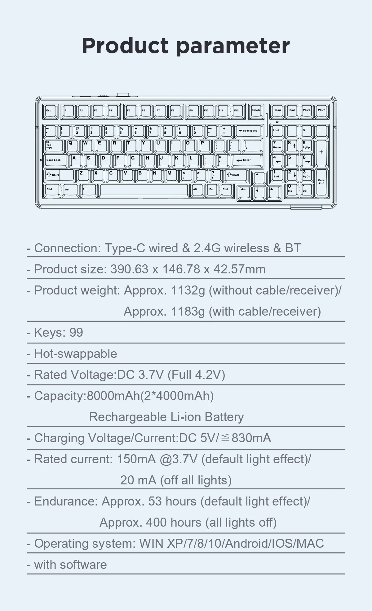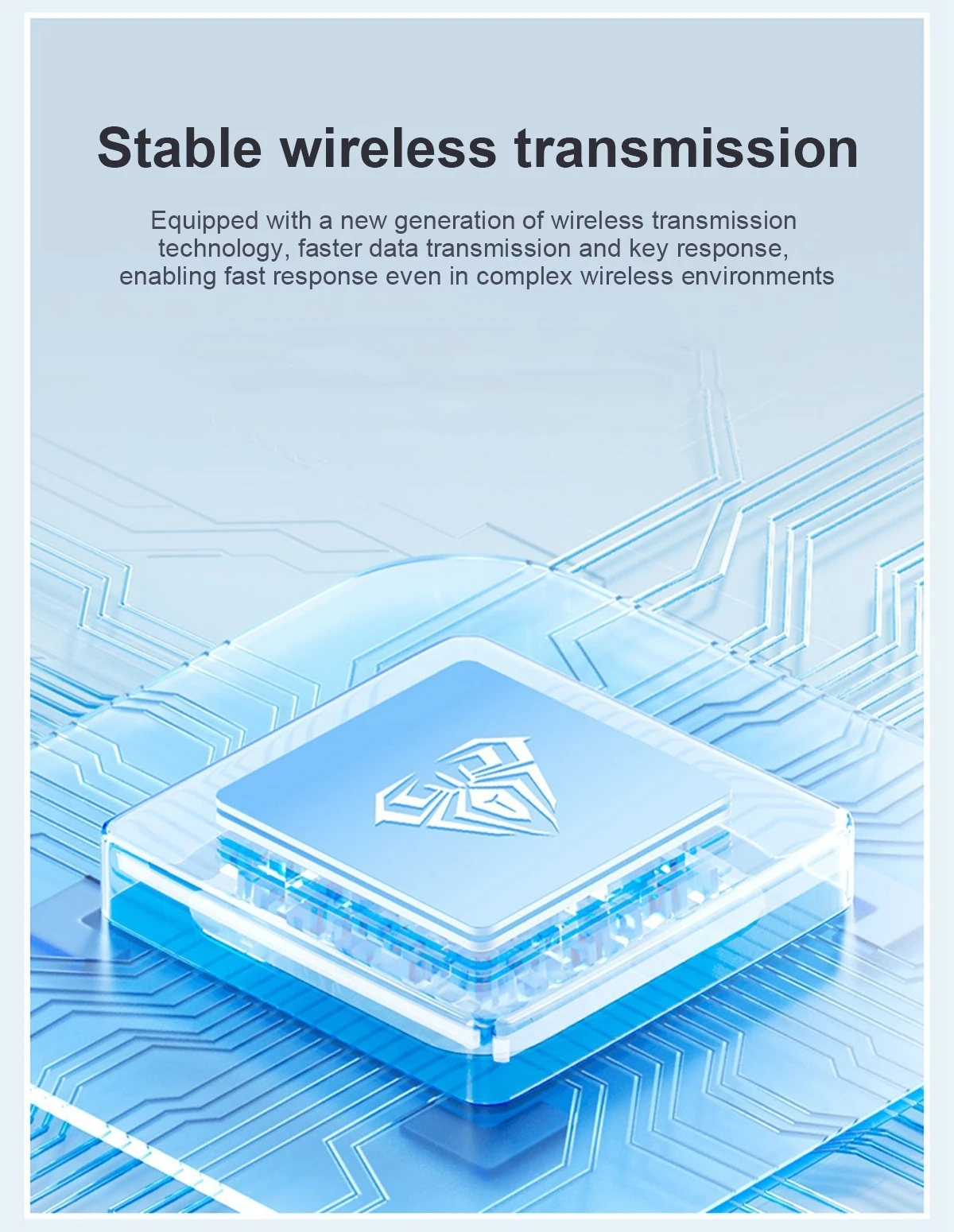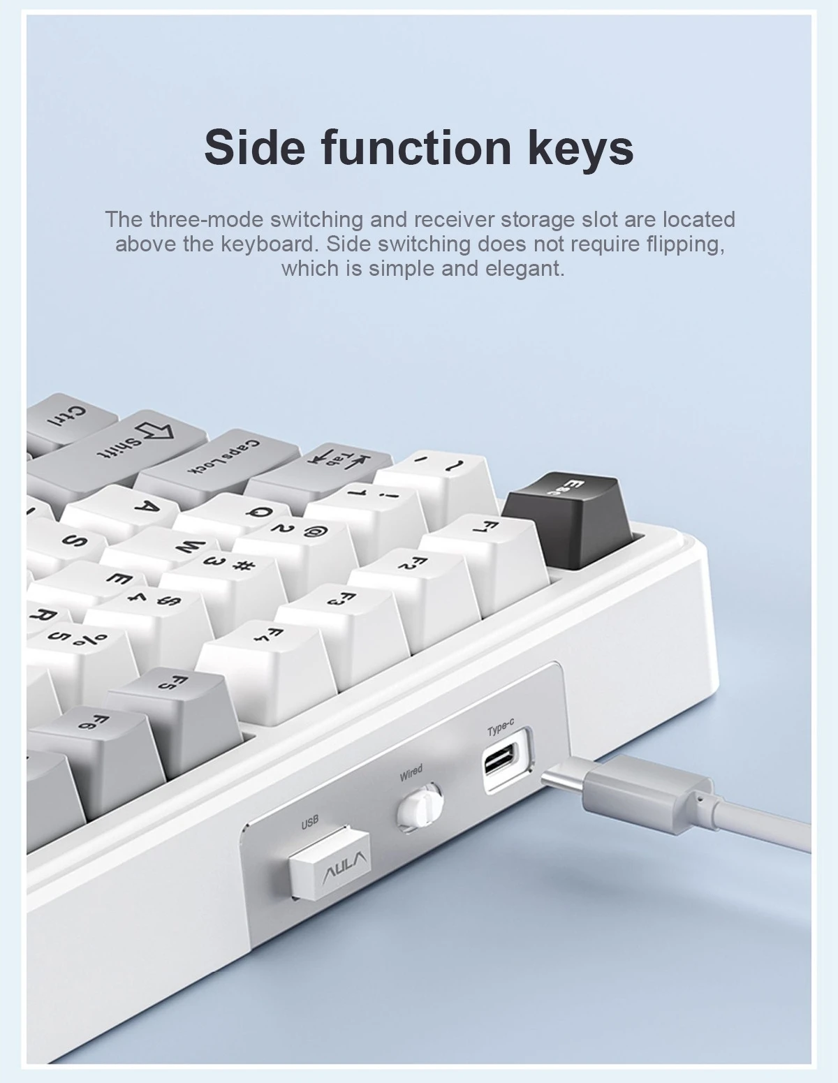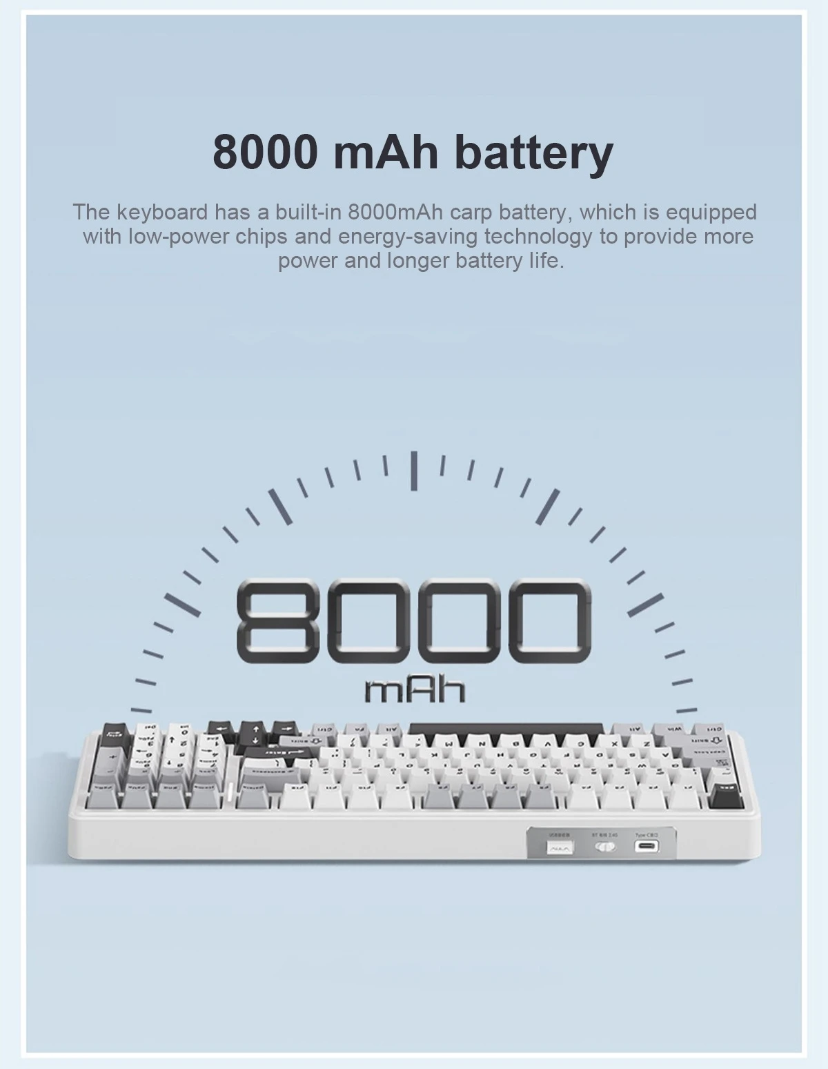 5--Batería de gran capacidad, excelente resistencia: AULA F99 equipado con una batería de litio incorporada de 8000 MHA de capacidad, que se puede cargar a través del cable tipo C mientras se usa en modo cableado.Cuando está completamente cargada, dura unas 400 horas con la luz apagada.