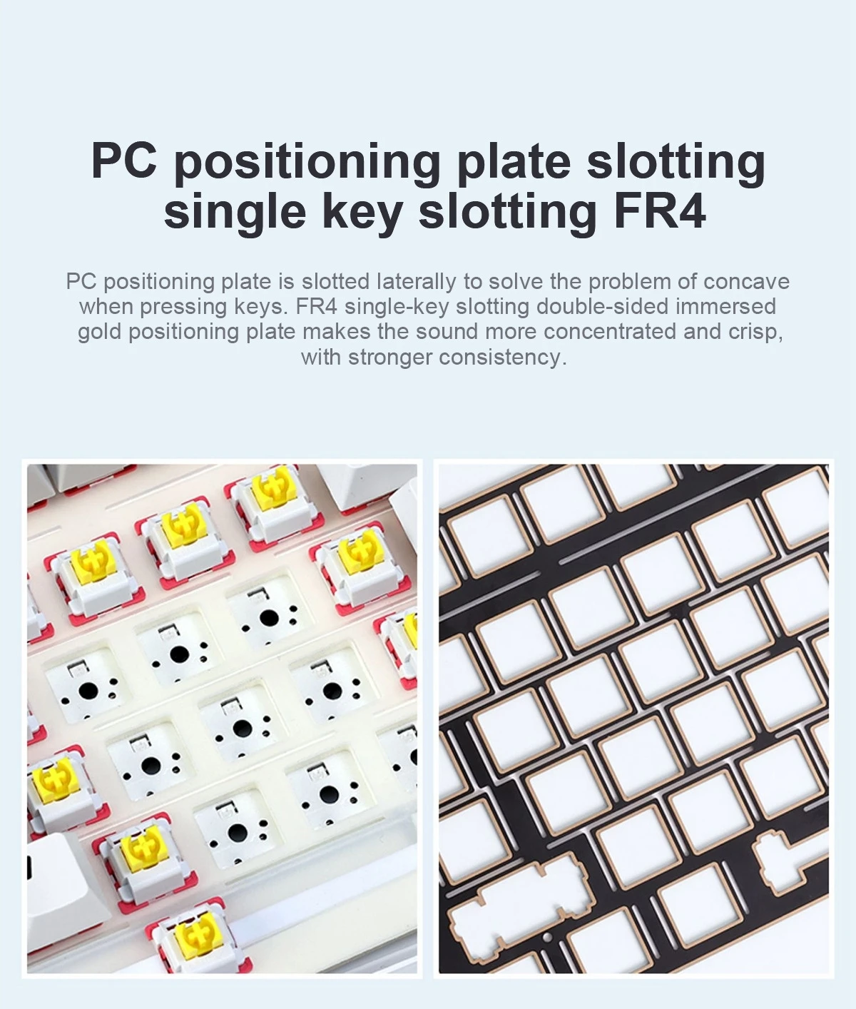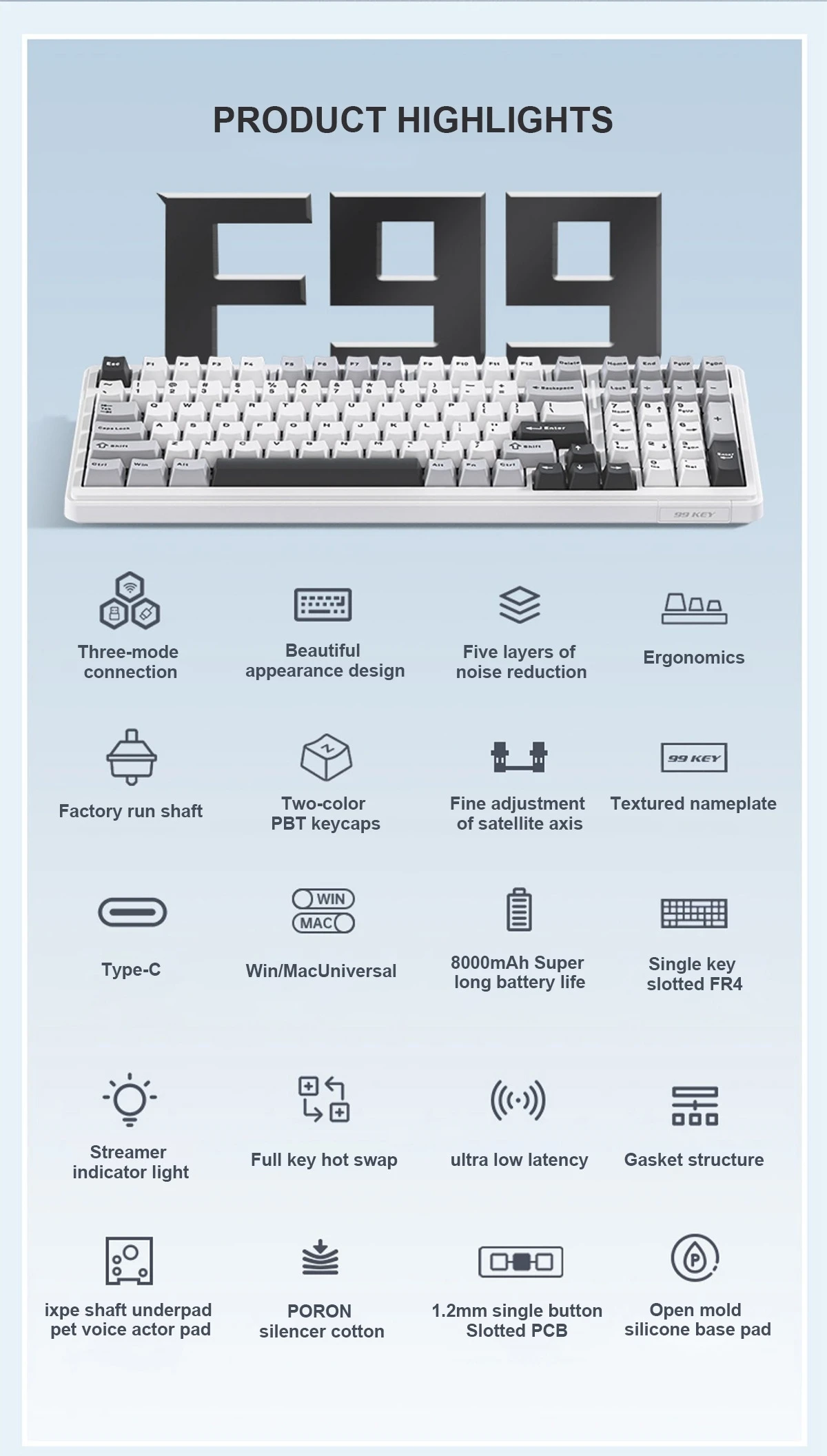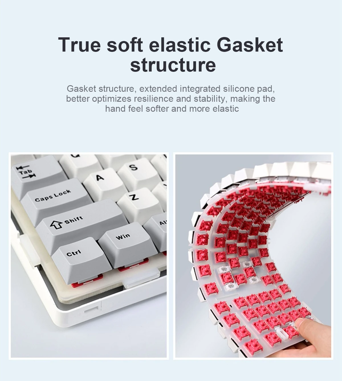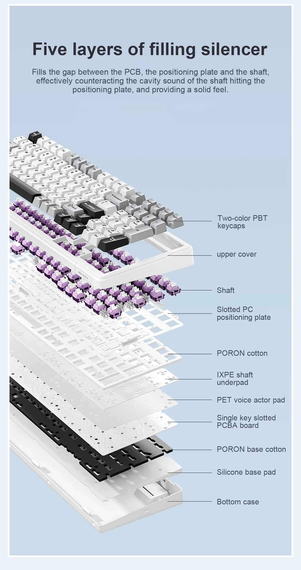 1--Estructura de junta con reducción de ruido de 5 capas: F99 es un teclado montado en junta con una placa de PC y almohadillas de silicona de primera calidad de 5 capas y algodón reductor de ruido para reducir el 95% del ruido hueco, aumentar el ruido de escritura y mejorar la exclusividad. suave y cómodo;
