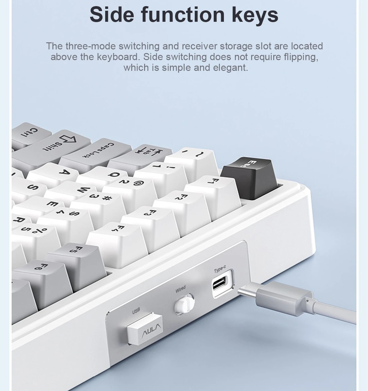 5--Batería de gran capacidad, excelente resistencia: AULA F99 equipado con una batería de litio incorporada de 8000 MHA de capacidad, que se puede cargar a través del cable tipo C mientras se usa en modo cableado.Cuando está completamente cargada, dura unas 400 horas con la luz apagada.