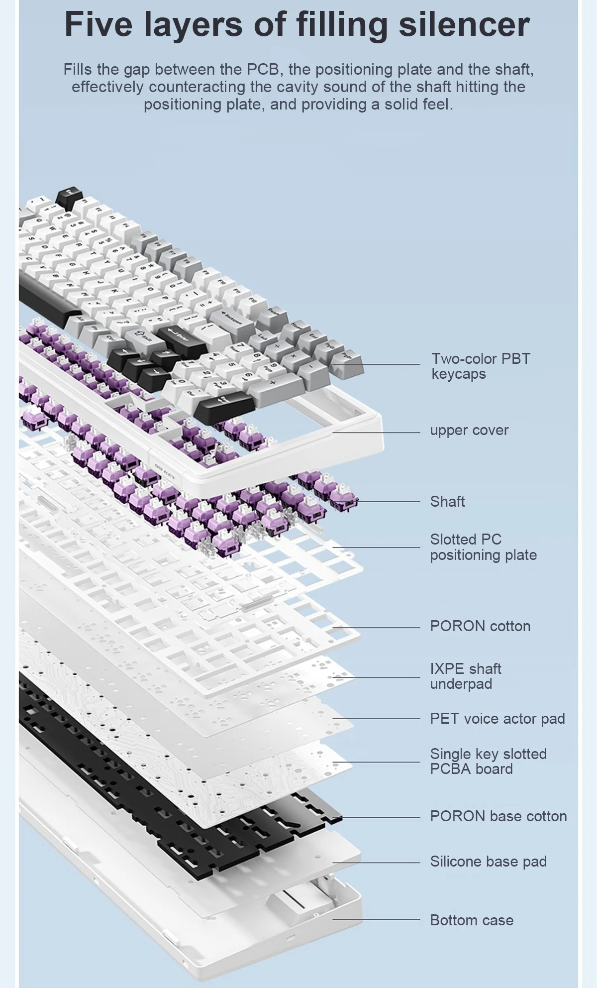 1--Estructura de junta con reducción de ruido de 5 capas: F99 es un teclado montado en junta con una placa de PC y almohadillas de silicona de primera calidad de 5 capas y algodón reductor de ruido para reducir el 95% del ruido hueco, aumentar el ruido de escritura y mejorar la exclusividad. suave y cómodo;