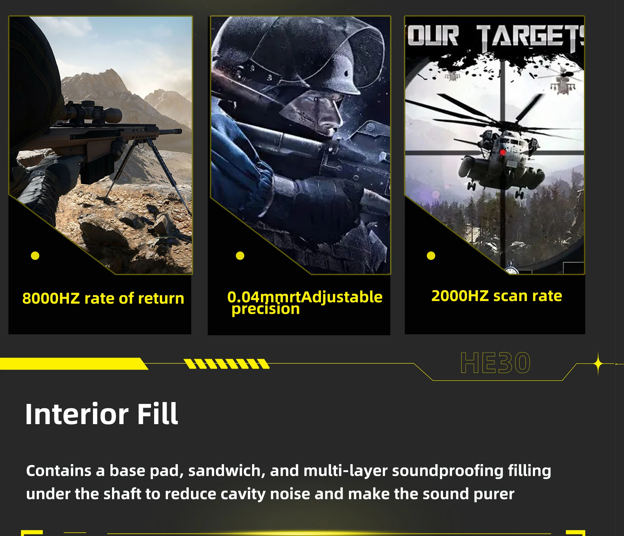 El teclado HE30 adopta un eje magnético de Hejin 7.0, carrera total de 3,8 ± 0,3 mm, presión de 0,3 mm de 37 ± 10 gf, presión de carrera completa de 60 ± 10 gf