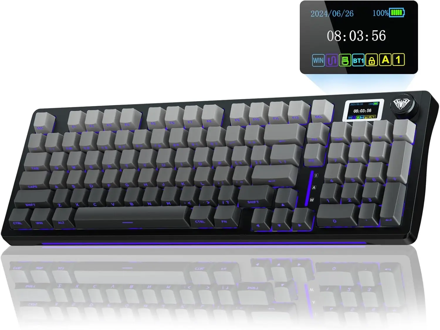 El elegante teclado mecánico inalámbrico AULA S98 Pro con pantalla LCD inteligente y perilla multifunción liderará la nueva tendencia.La página de inicio de la pantalla muestra diversas información como fecha, hora, nivel de batería, sistema, modo de conexión e indicador de estado.Al girar o presionar la perilla multifunción, puede ajustar el sistema, el modo de conexión, el volumen, el modo de luz RGB, el idioma y la imagen de la pantalla/GIF (Nota: debe descargar el software en el sistema Windows y mantenerse en modo cableado para configurar la imagen/GIF de la pantalla, calibrar la fecha y la hora)