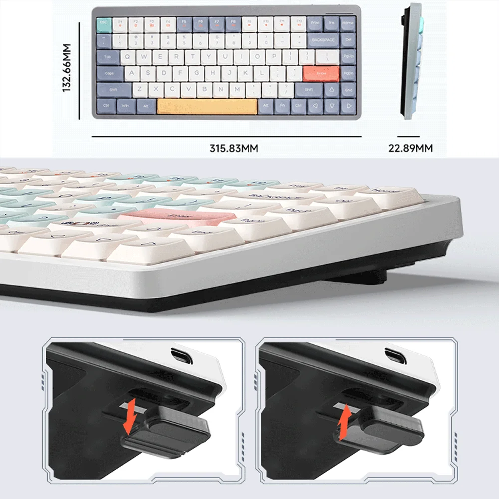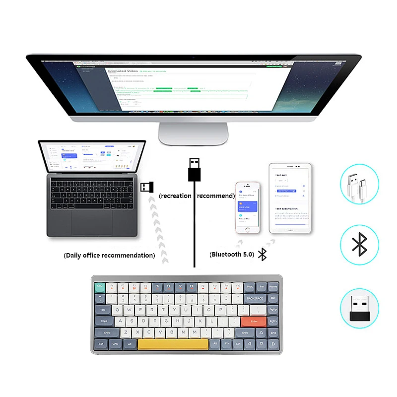 YK75 V2 adopta tres modos de conexión de 2,4G, Bluetooth 5,0 y tipo C, el rango de recepción de 2,4G es de 8 metros, el rango de recepción de Bluetooth es de 5M, la batería de litio incorporada de 1850mA 3,7 V es recargable.