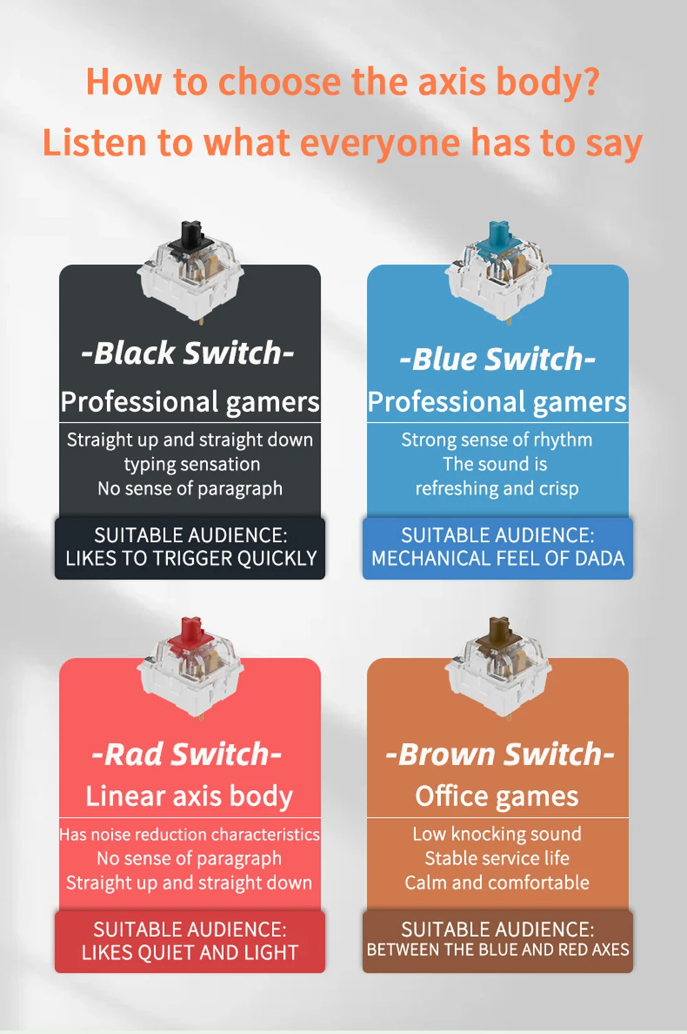 Descriptions: The linear switching characteristic combined with the low spring resistance triggers directly. The Red Switch is the first choice for beginners in the world of mechanical keyboards.The smooth-running enables balanced writing and gaming sessions.