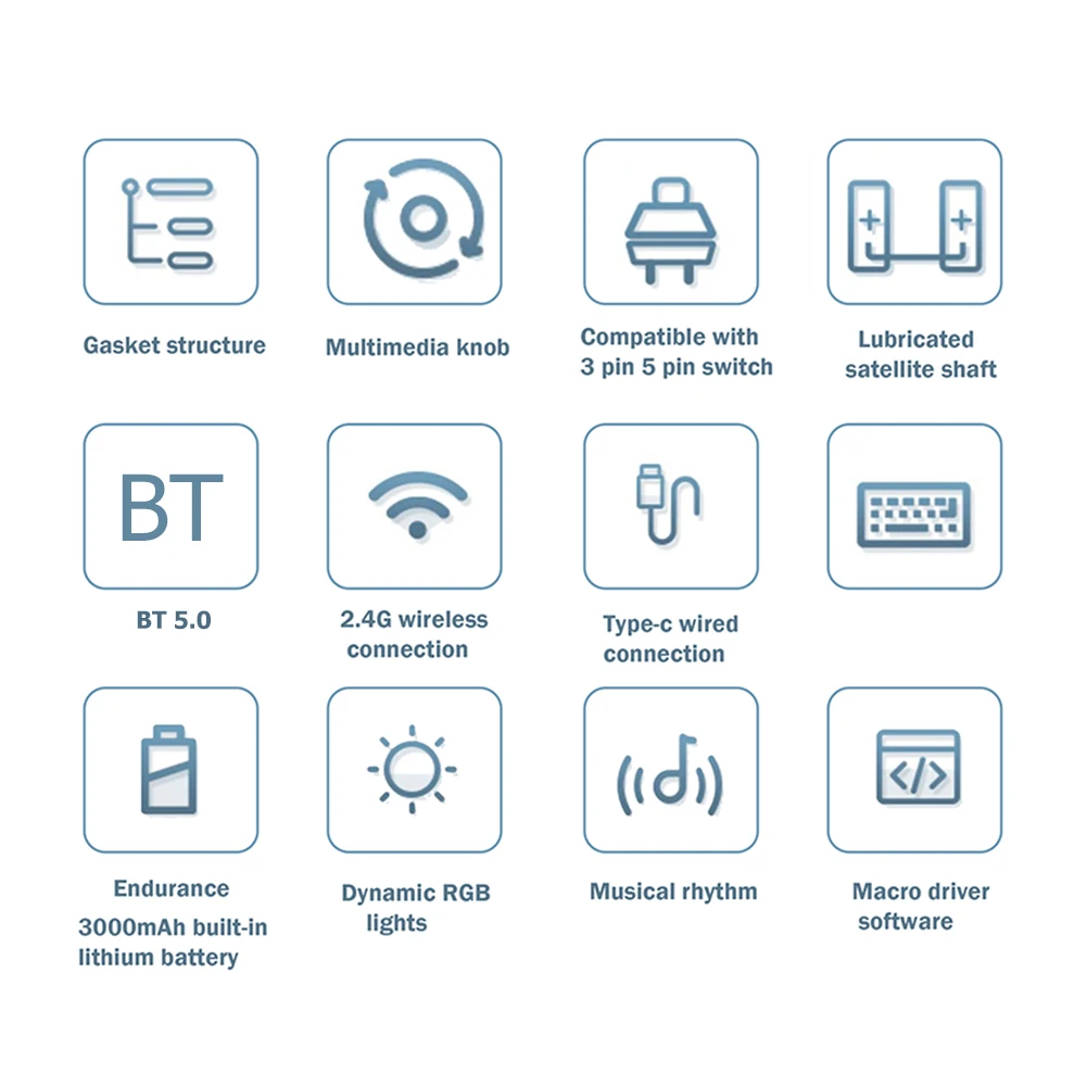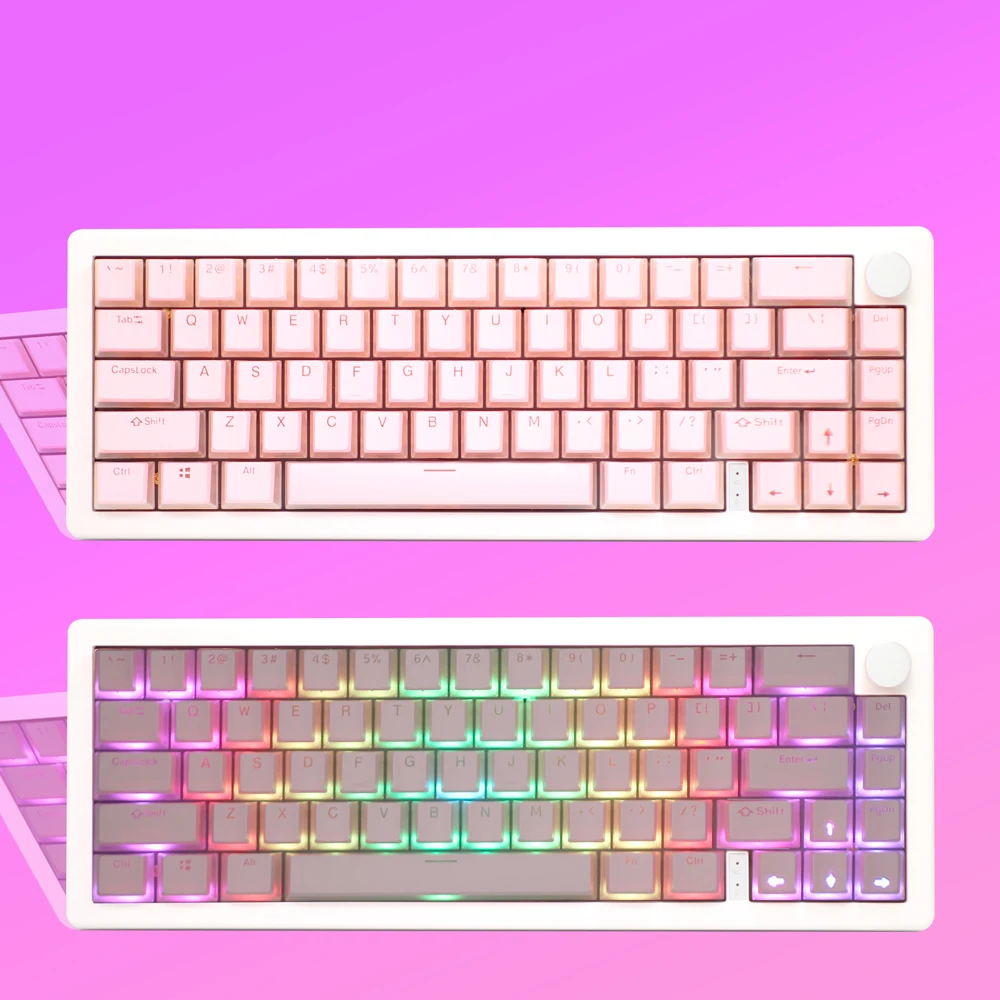 1. 3 modos:GM068 es una tecla 67 estándar, 3 modos de teclado RGB de retroiluminación de juego en interruptor mecánico con cable + compatible con Bluetooth + 2,4G. Admite la actualización en línea USB del firmware, combinación de teclas FN para conmutación de funciones de hardware, NKRO, ajuste de modo de retroiluminación múltiple y para blindaje y desarrollo de teclas de función de ventana.