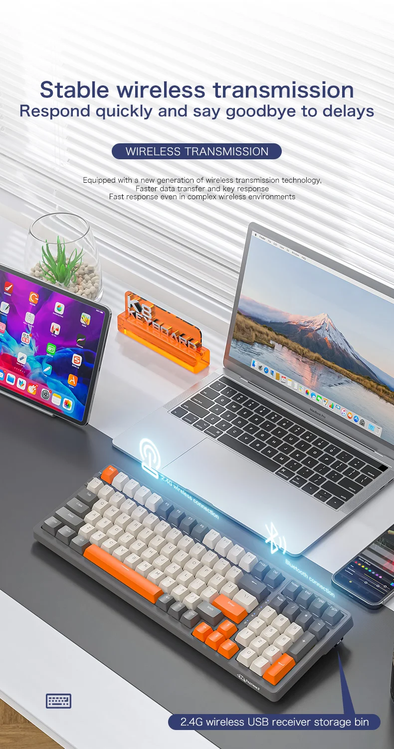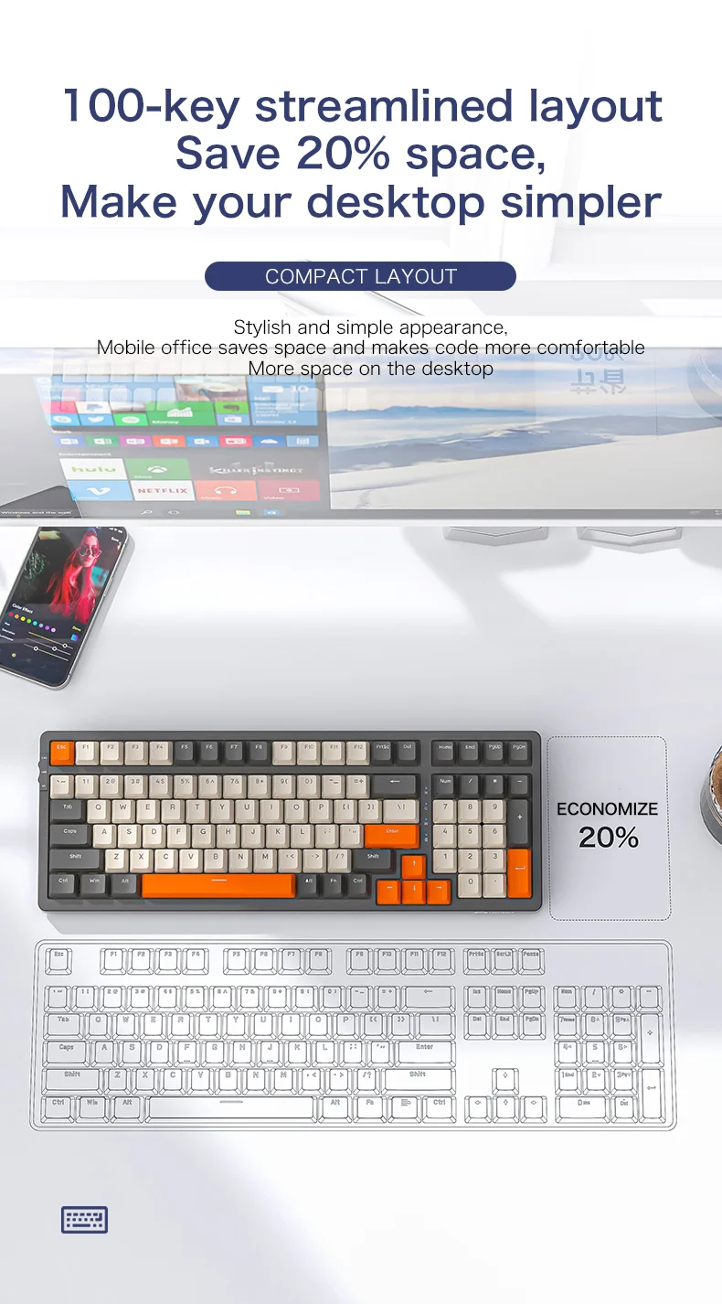 Descripción del producto: 1. Estructura del silenciador de la Junta 2. Diseño de 100 teclas 3. Llave completa sin impulso 4. Compatibilidad multisistema 5. Intercambio en caliente de llave completa 6. 18 efectos de iluminación 7. Conexión de tres modos