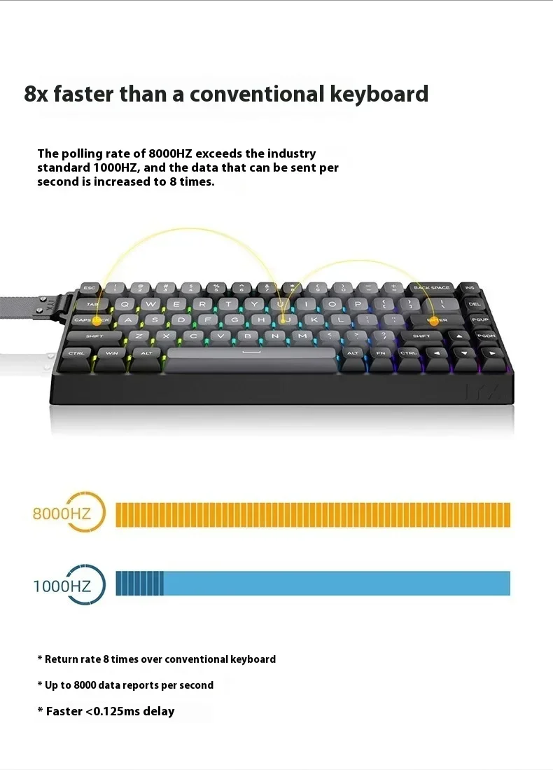 1.Respuesta de velocidad ultra alta: con una velocidad de retorno de 8000 Hz y un programa de controlador de desarrollo propio, se logra una latencia ultrabaja, capturando con precisión cada operación clave y permitiendo ejecutar instrucciones del juego al instante, lo que le ayuda a aprovechar la oportunidad del juego.