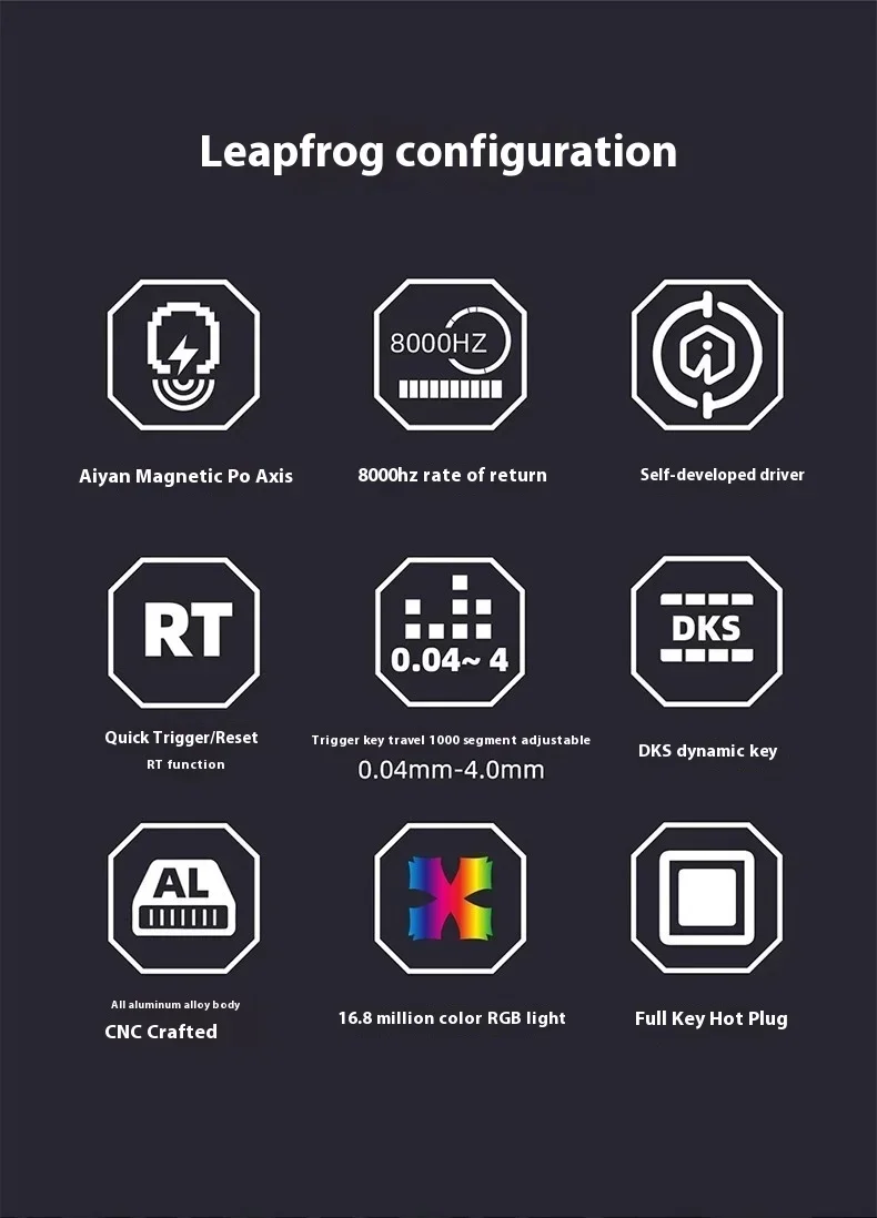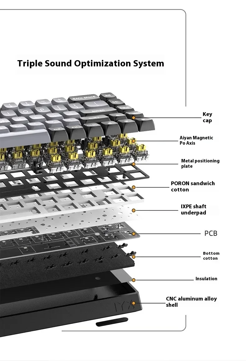 4.Excelente sensación en la mano y efecto de sonido: el eje magnético de pimienta Aiyan se activa con el efecto Hall, con una carrera completa de 4,0 ± 0,3 mm y una presión de disparo de 35 ± 5 gf.El rebote es rápido, la sensación de la mano es lineal y suave y el sonido del botón es nítido y agradable.Cada pulsación de tecla es un placer.