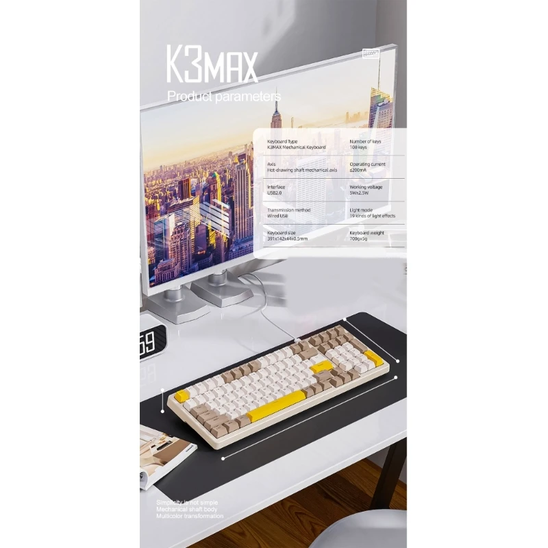 Características:Teclado mecánico de 100 teclas exquisito y conveniente br/ Admite teclas completas intercambiables en caliente, sensación de botón cómodo. br/ Admite la conexión Gmode 2,4 y todos los ordenadores de sobremesa, portátiles y dispositivos móviles. br/ La vida útil de las teclas supera los 100 millones de veces, el doble que la de otros teclados. br/ El teclado adopta un eje mecánico altamente duradero y un ajuste de alta precisión, lo que hace que la posición de la tecla grande parezca más estable br/ Especificaciones:Modelo: K3MAXTipo de artículo: Teclado mecánicoMaterial: ABSRetroiluminado: RGB 19 retroiluminadoTeclas: 100 teclasIntercambio en caliente: SíFuente de alimentación: Puerto USBAdecuado para: PCTamaño: aproximadamente 391x142x4mm/15,4x5,59x1,73 pulgadasNota:Debido a los diferentes monitores y efectos de luz, el color real del artículo puede ser ligeramente diferente del color mostrado en las imágenes. ¡Gracias!Permita una desviación de medición de 1-2cm debido a la medición manual.El paquete incluye