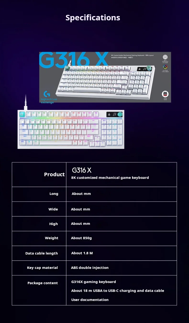 Teclado mecánico para juegos Logitech G316X, con cable, 8K RGB, intercambiable en caliente, personalizable, diseño ergonómico de 98 teclas, interruptor L, blanco