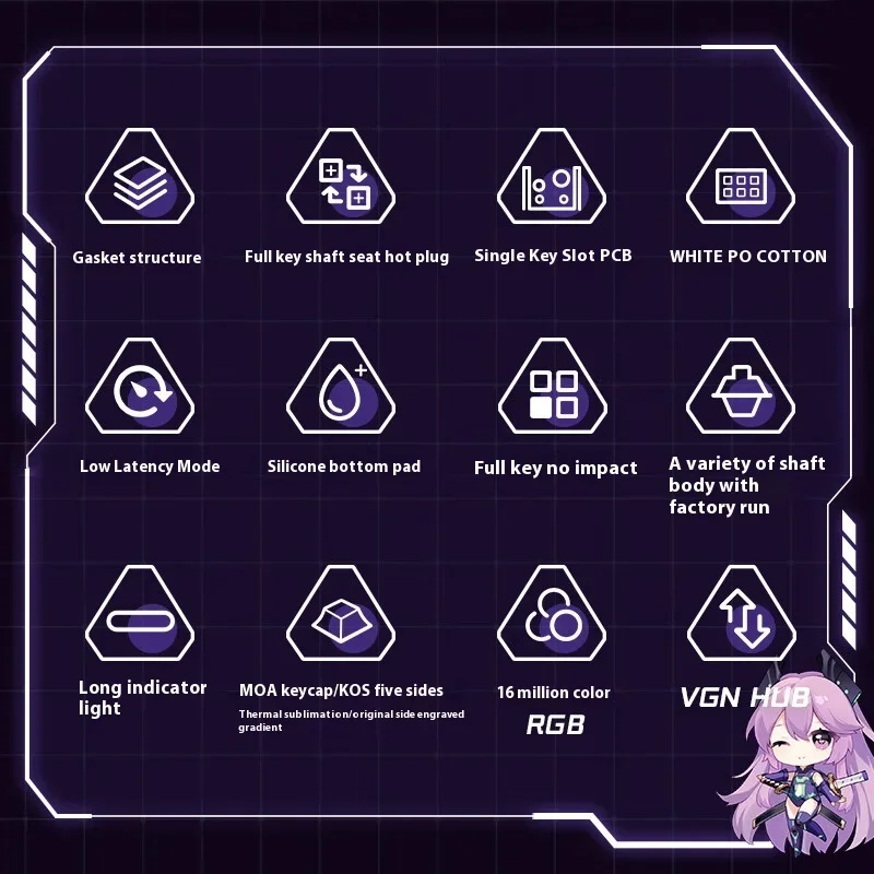 Las teclas PBT texturizadas en un gradiente de estrella de campo resisten el brillo y las huellas dactilares durante las sesiones de codificación de maratón, mientras que la retroiluminación RGB orientada al sur proyecta un brillo etéreo a través de leyendas grabadas lateralmente, personalizable mediante software para sincronización de juegos pulsante o tonos estáticos minimalistas14.