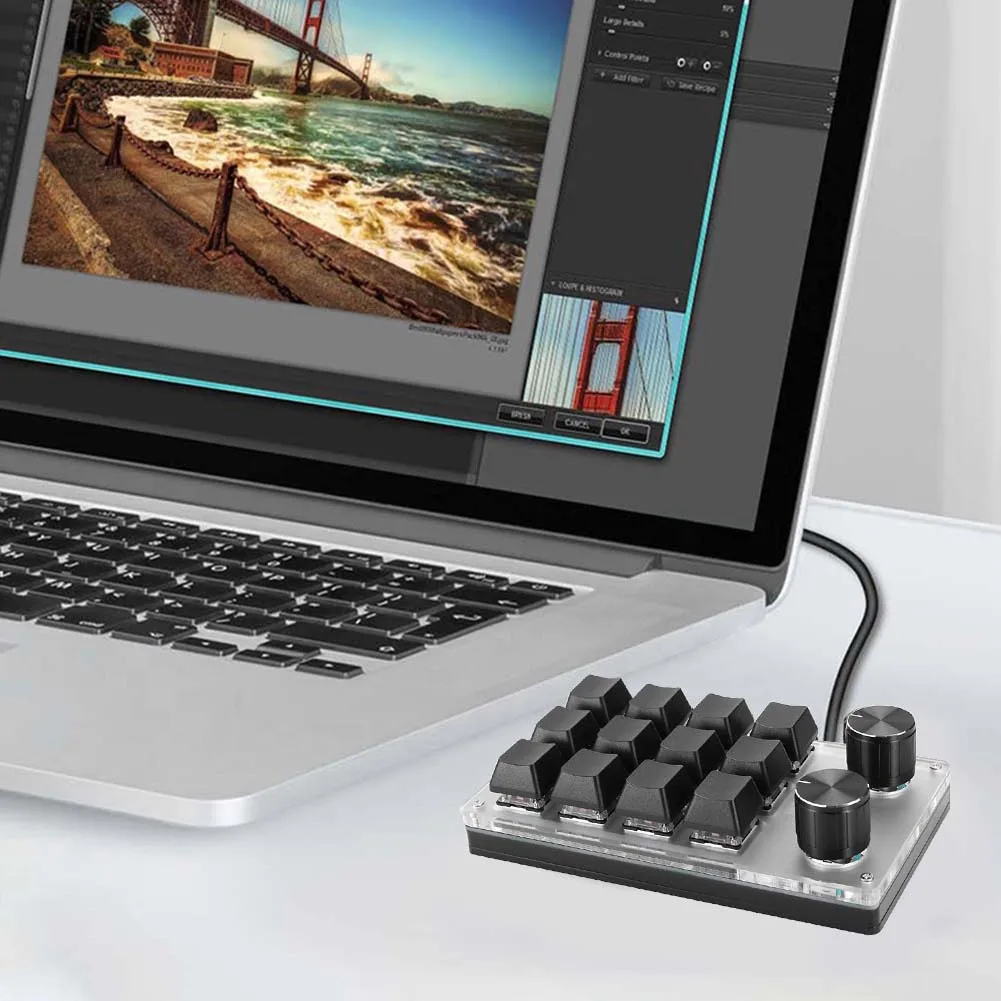 12 teclas y 2 perillas son programables: 12 teclas, se presiona la perilla, se puede personalizar la rotación en el sentido de las agujas del reloj y la rotación en el sentido contrario a las agujas del reloj.
