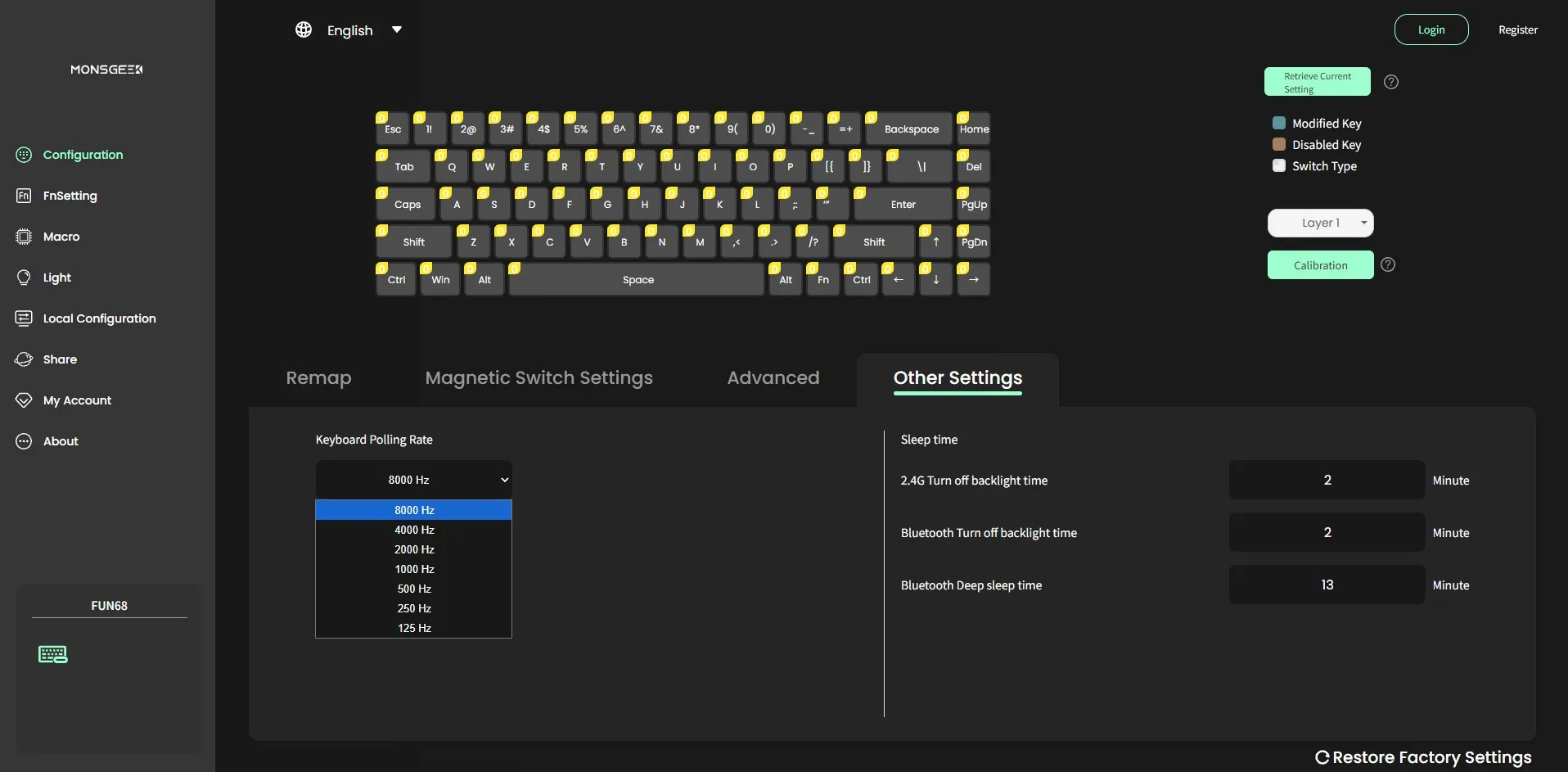 La serie FUN68 ofrece compatibilidad cruzada con 5 interruptores magnéticos de terceros.Los usuarios pueden seleccionar el interruptor correspondiente de la lista del controlador MonsGeek y calibrar fácilmente el teclado después del reemplazo.También puedes mezclarlos y combinarlos en diferentes teclas simultáneamente.