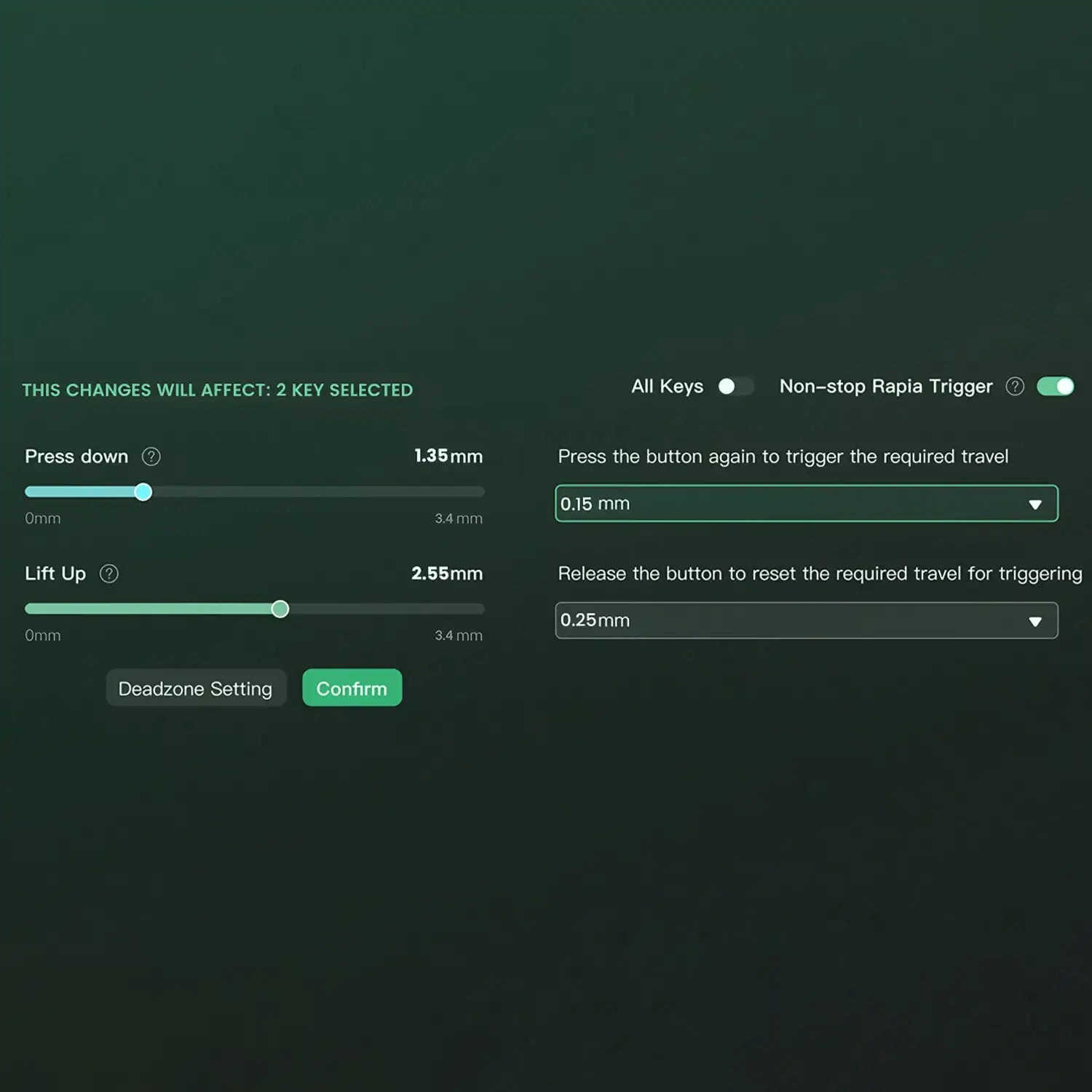 El gatillo rápido cambia dinámicamente los puntos de activación y activación de las teclas.A través del controlador MonsGeek, los usuarios pueden elegir los modos de personalización "Todos los botones" o "Por botón", así como activar "Disparador rápido sin parar" para una respuesta de tecla casi instantánea.Esto le da a los jugadores de FPS una ventaja competitiva en un juego acelerado.