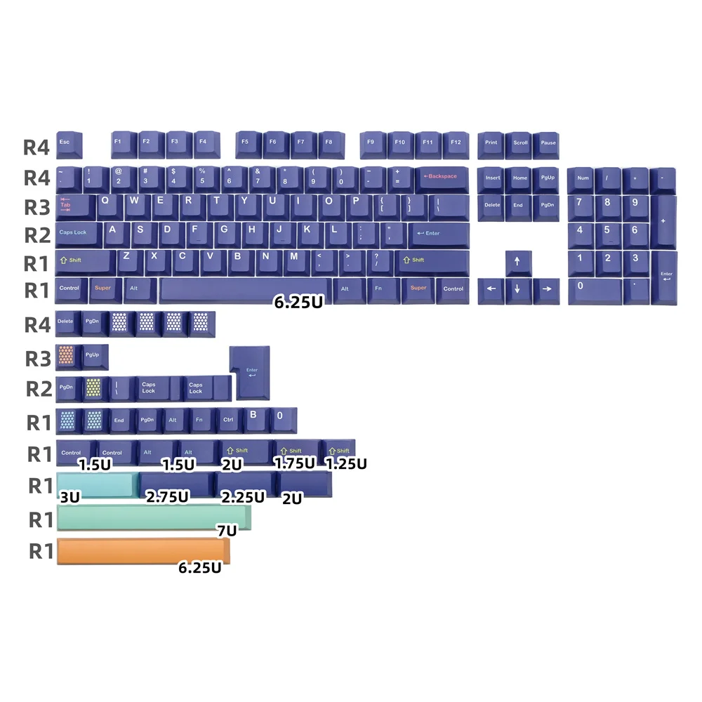 Es con tecla ISO enter, 1.25U, 1.75U, 2U, 2.25U Shift y 2U, 2.25U, 2.75U, 3U 6.25U, 7U Barra espaciadora