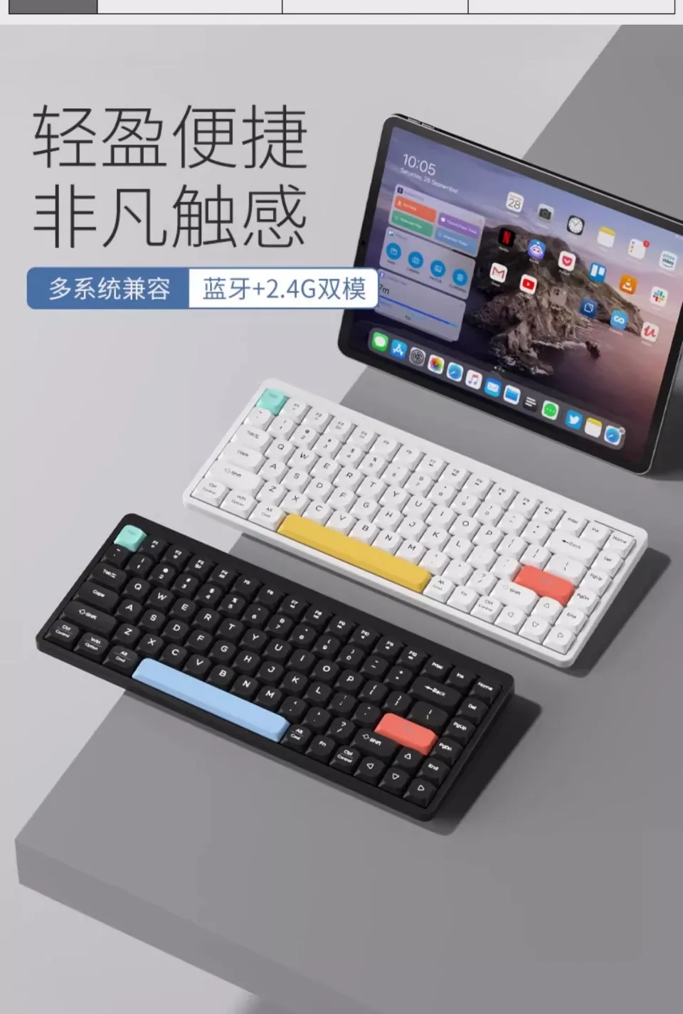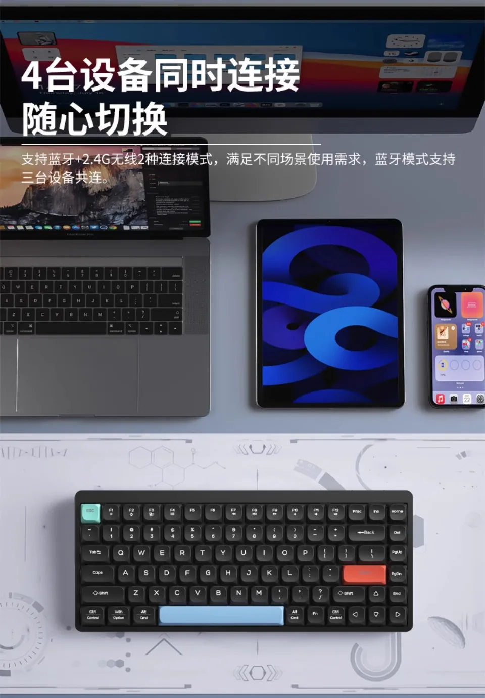 1. Tri-modo inalámbrico, fácil cambio entre múltiples dispositivos, admite conexión Bluetooth + por cable, se puede usar Escritorio, computadora portátil, tableta, teléfono móvil
