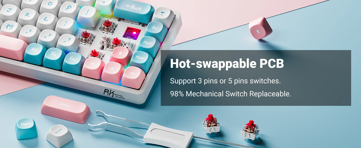3. Intercambiable en caliente- La PCB de intercambio en caliente le permite reemplazar interruptores de 3 pines/5 pines libremente sin problemas de soldadura.Disfruta de la diversión de crear tu propio teclado único.