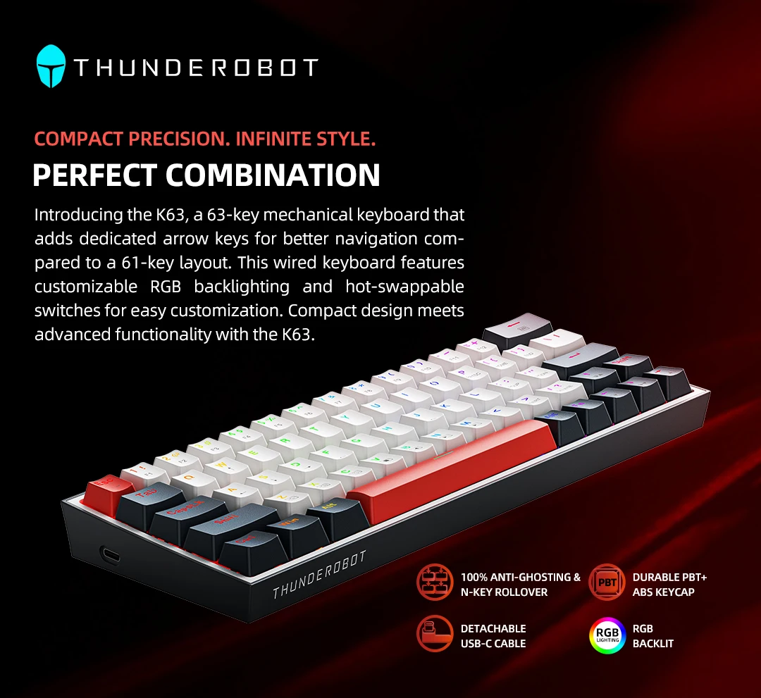 Presentamos el K63, un teclado mecánico de 63 teclas que agrega teclas de flecha dedicadas para una mejor navegación en comparación con un diseño de 61 teclas.Este teclado con cable cuenta con retroiluminación RGB personalizable e interruptores intercambiables en caliente para una fácil personalización.El diseño compacto cumple con la funcionalidad avanzada con el K63.