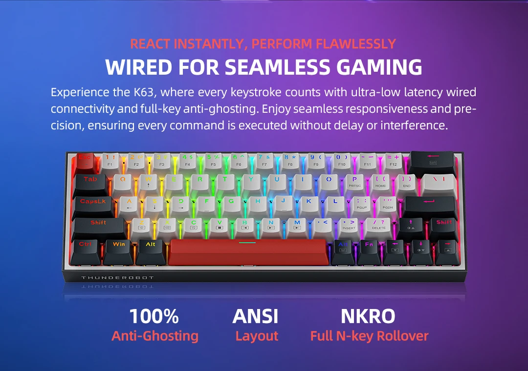Experimente el K63, donde cada pulsación de tecla cuenta con conectividad por cable de latencia ultrabaja y anti-ghosting de teclas completas. Disfrute de una capacidad de respuesta y precisión perfectas, asegurando que cada comando se ejecute sin demoras ni interferencias.