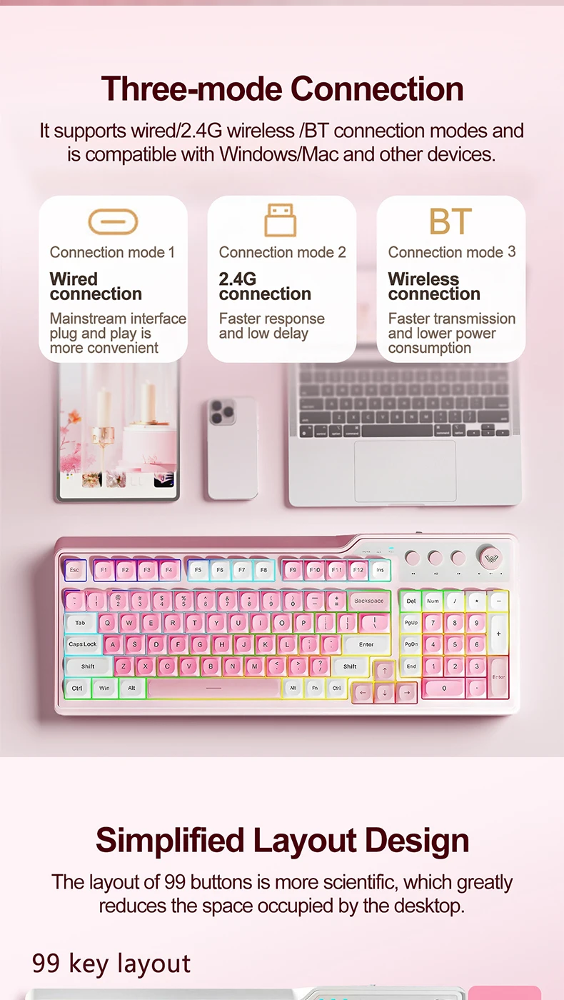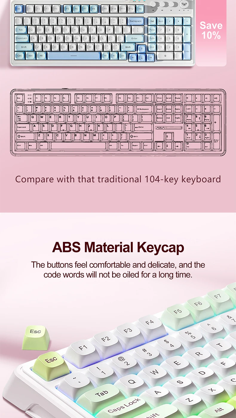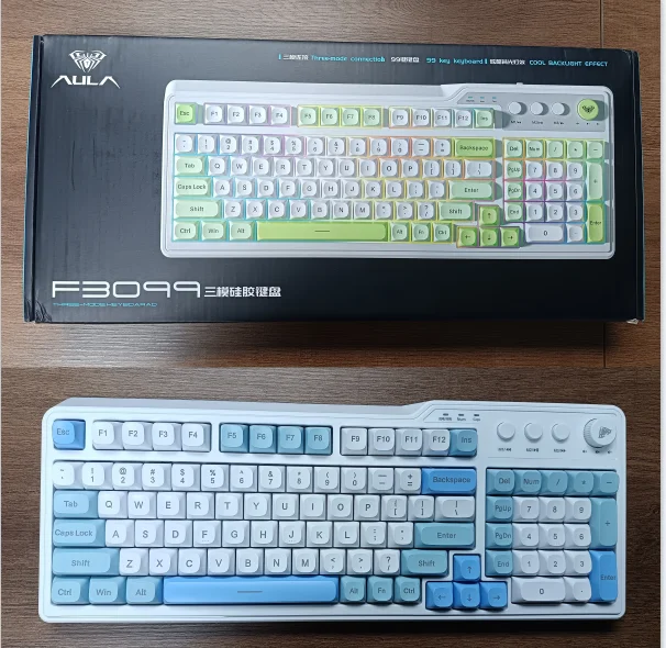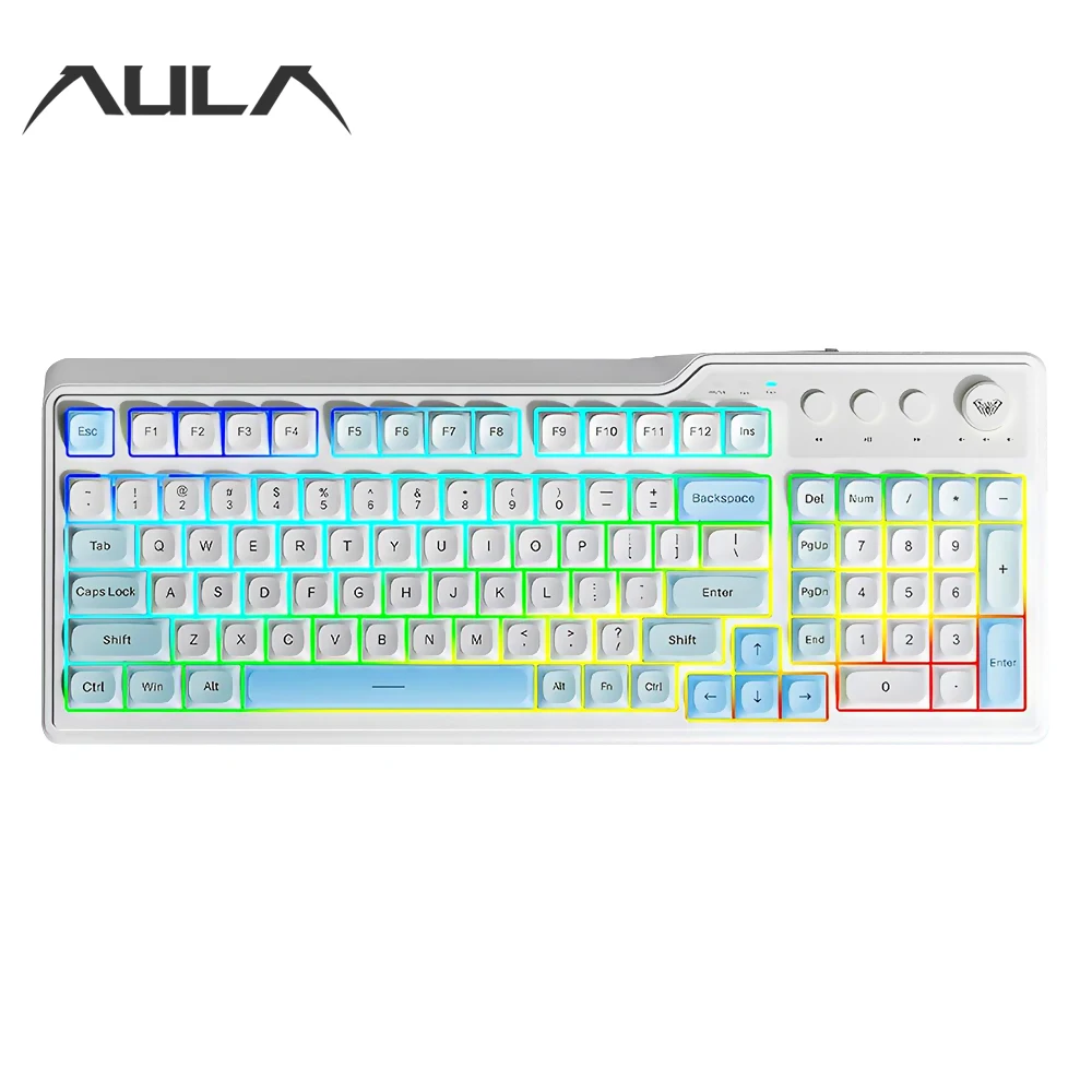 Teclado de membrana AULA F3099, luz retroiluminada RGB de 99 teclas, teclado para juegos de tres modos, sonido de tecla suave, teclado de oficina con botón giratorio