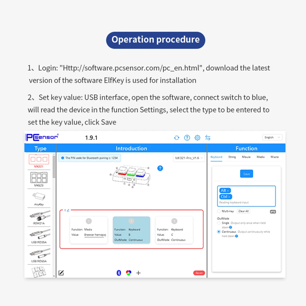 2. Establezca el valor clave: Interfaz USB, abra el software, conecte el interruptor a azul, el dispositivo se leerá en la configuración de la función, seleccione el tipo de entrada, configure el valor clave, y haz clic en Guardar