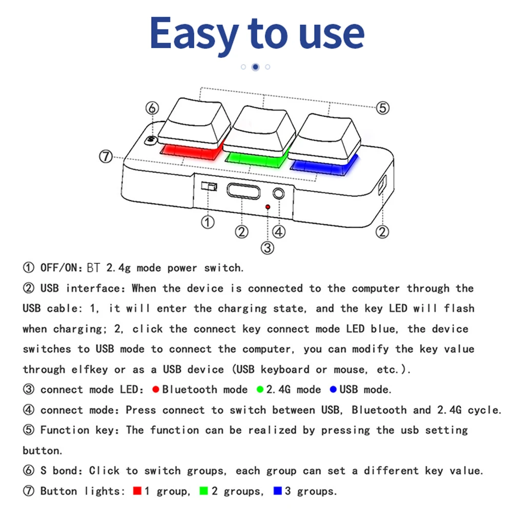 Interfaz USB: Cuando el dispositivo está conectado al ordenador a través de un cable USB: 1. Entrará en el estado de carga y el LED del botón parpadeará durante la carga; 2. Haga clic en el botón de conexión para conectar el modo LED azul, y el dispositivo cambia al modo USB para conectarse al ordenador. Puede utilizar los valores de elfkey o Modify key como dispositivo USB (teclado o ratón USB, etc.).