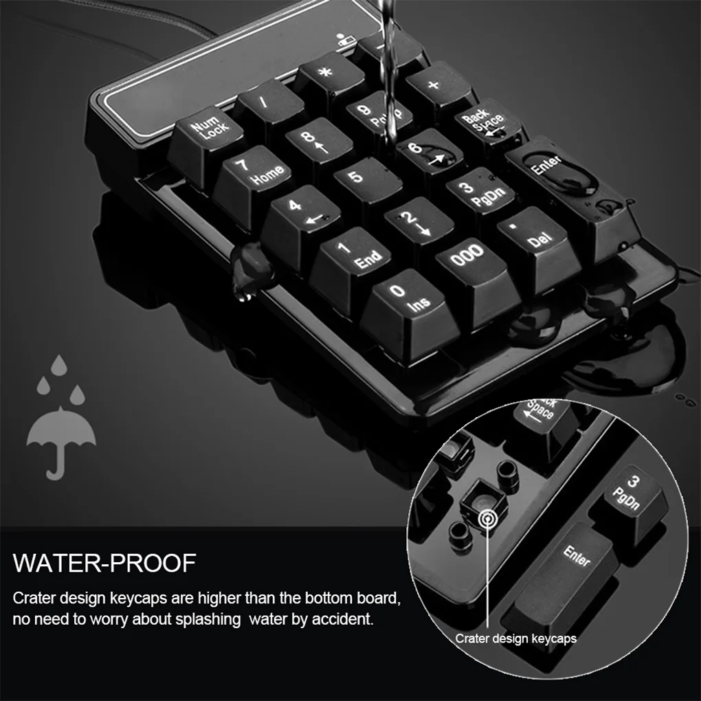 Diseño antisalpicaduras: el diseño de apertura más alto que la superficie de la tecla puede prevenir eficazmente la entrada accidental de agua sin preocuparse por la entrada de té y el fallo del teclado.Sensación de entrada: las teclas numéricas se ajustan a la forma de las puntas de los dedos, se sienten cómodas y ordenadas, y tienen un fuerte sentido del ritmo de escritura.Teclas sensibles: el teclado digital tiene teclas sensibles, que pueden garantizar la calidad y mejorar la comodidad de uso, y se puede usar durante mucho tiempo sin fatiga.Diseño razonable: aumenta el espacio entre las teclas del teclado para evitar errores durante la entrada rápida y mejorar la eficiencia del trabajo.Amplia compatibilidad: la entrada digital del teclado funciona de forma independiente, no tiene conflictos con el teclado del ordenador en sí, es compatible con varios sistemas operativos.