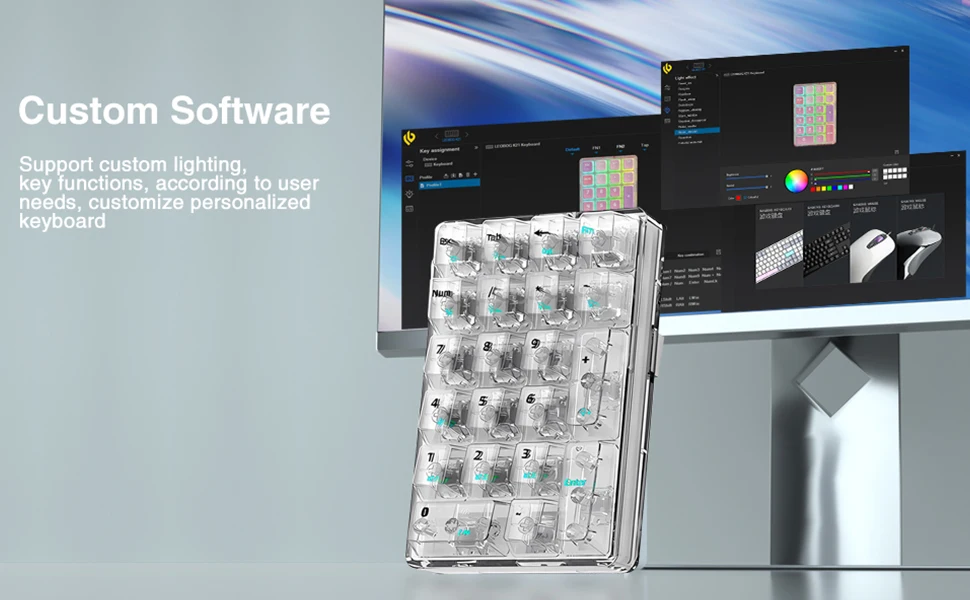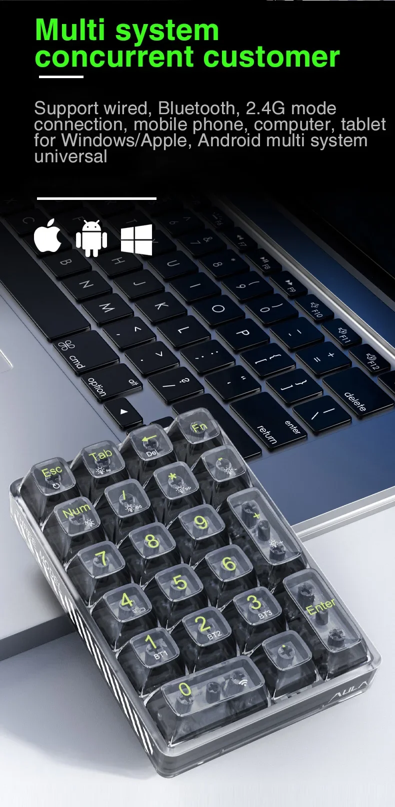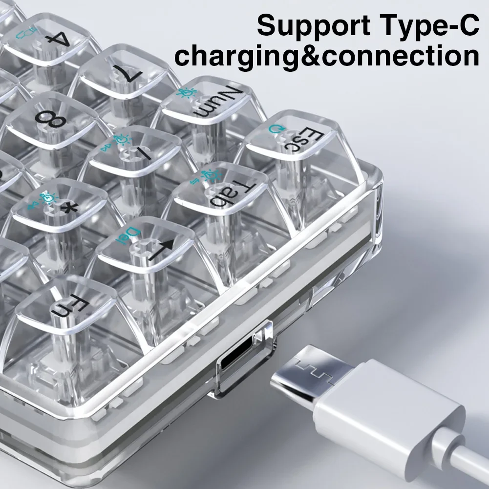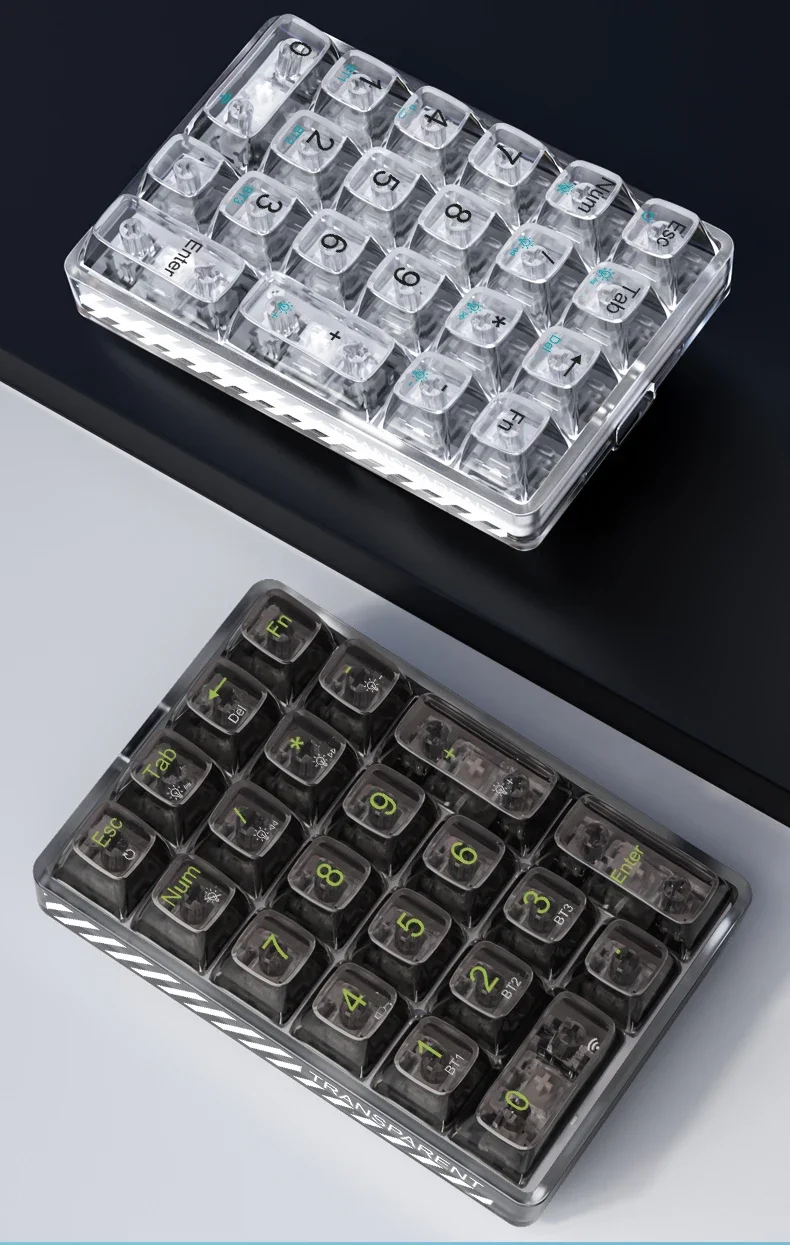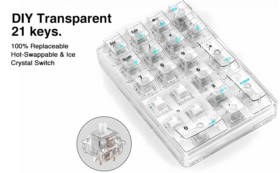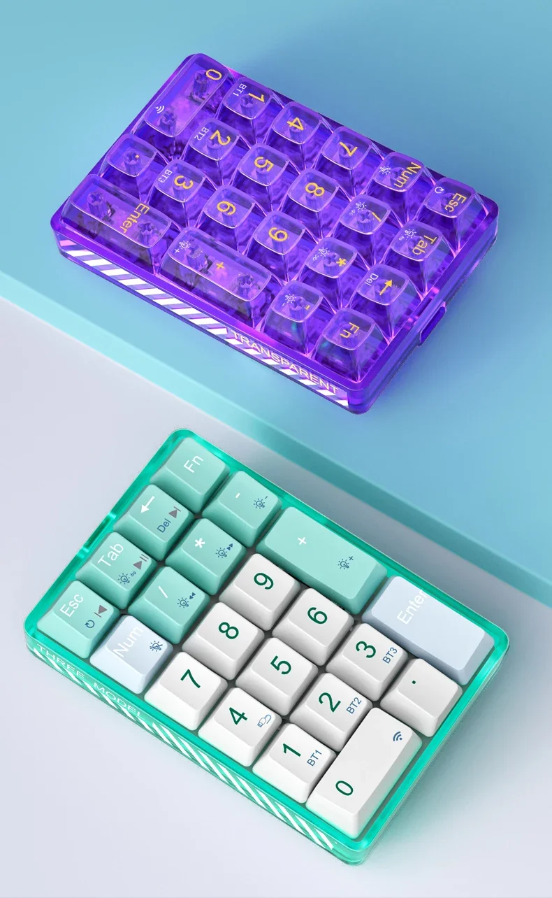 Este teclado numérico admite tres modos de conexión Bluetooth 5.2 con cable, inalámbrico, Bluetooth se puede conectar a tres dispositivos para satisfacer sus necesidades según diferentes necesidades.El color de la luz es blanco y tiene teclas transparentes que lo convierten en un bonito teclado.