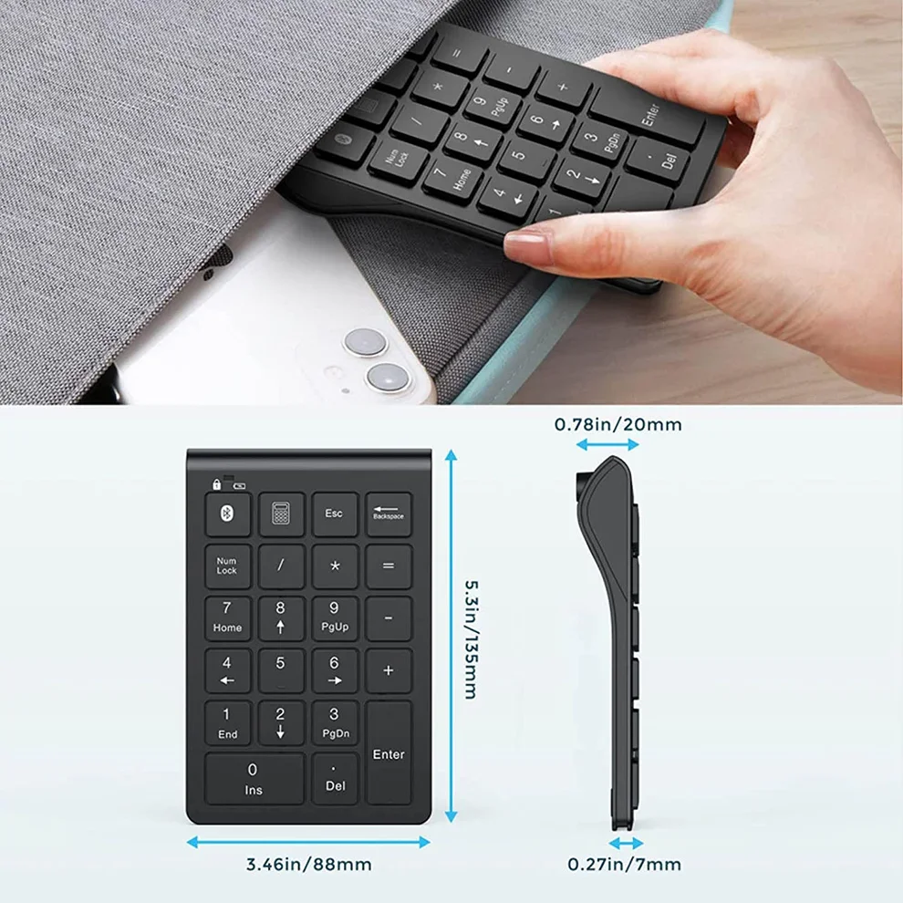 【DISEÑO ELEGANTE, PORTÁTIL Y ERGONÓMICO】 Nuestro teclado numérico de 10 teclas con Bluetooth es de solo 93g/0,2 lb, 5,2*3,46*0,27 pulgadas; Ligero y portátil. Coloque fácilmente este teclado Bluetooth ultra delgado en su bolsa de portátil, mochila, maleta o bolsillos sin ocupar espacio. La inclinación ergonómica integrada proporciona una experiencia de escritura cómoda y suave y reduce la tensión. El teclado numérico inalámbrico compacto es ideal para el hogar, la Oficina, los viajes, los viajes de negocios y más.