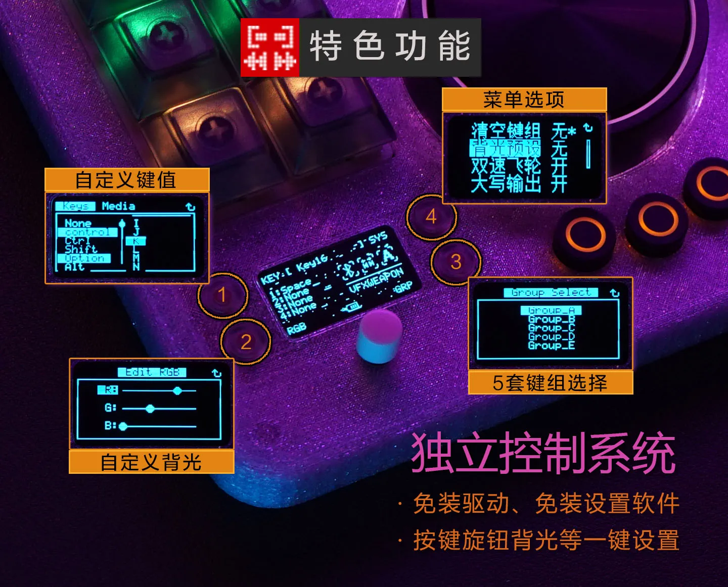 Configuración con un clic, como botones, perillas, retroiluminación, etc.