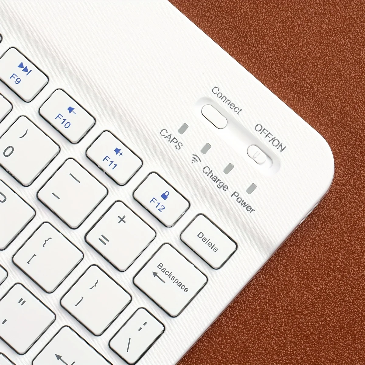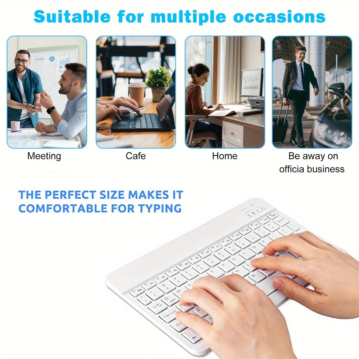 Características: 1.Excelente compatibilidad: el teclado compatible con Bluetooth es compatible con sistemas iOS, Android y Windows.Es perfecto para teléfonos inteligentes con tabletas Apple iPhone, iPad Mini, iPad Pro, iPad Air, Android Samsung LG Windows. 2.Ligero, portátil y compacto: este teclado es mucho más liviano y más pequeño que el teclado tradicional.Puedes transportarlo fácilmente sin ocupar más espacio en tu escritorio o bolso.Dimensiones del teclado de 10 pulgadas: 25 x 15 x 0,6 cm, peso: 180 g.【Tamaño: 9,84 x 5,9 x 0,24 pulgadas, peso: 6,35 onzas/0,4 libras】 3. Uso a largo plazo: batería de litio recargable incorporada, después de cargarse completamente, se puede usar durante más de 20 días (cuando se usa de forma continua durante 2 horas al día).Si no lo usa durante más de 10 minutos, el teclado entrará automáticamente en estado de suspensión para ahorrar energía.Si desea seguir usándolo, simplemente haga clic en cualquier tecla para activar el teclado. 4. Cómodo teclado compatible con Bluetooth: las teclas del teclado tienen una estructura de tijera, diseño ergonómico de tecla cuadrado de chocolate.Utilice este teclado para escribir silenciosamente en su tableta, iPad, iPhone, teléfono inteligente y brindarle una experiencia de escritura cómoda y placentera. 5. Conexión compatible con Bluetooth: el teclado adopta tecnología estable compatible con Bluetooth 3.0, la distancia de trabajo es de hasta 10 m.El teclado tiene un diseño QWERTY de EE. UU., fácil de usar, tiene teclas de acceso rápido, como control de volumen, reproducción y pausa, anterior y siguiente, etc.El frente está cepillado, la parte posterior tiene un diseño de aleación de aluminio ultrafino y suave.