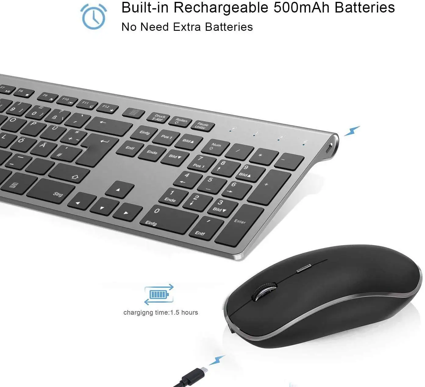 Pilas recargables reciclables: ¡ya no es necesario reemplazar o desechar las pilas alcalinas! Tanto el teclado como el ratón inalámbricos tienen baterías de iones de litio de 500 mAH incorporadas; una recarga completa proporciona más de 120 horas de trabajo. Y el teclado y el ratón entrarán automáticamente en modo de suspensión inteligente si no hay actividades en