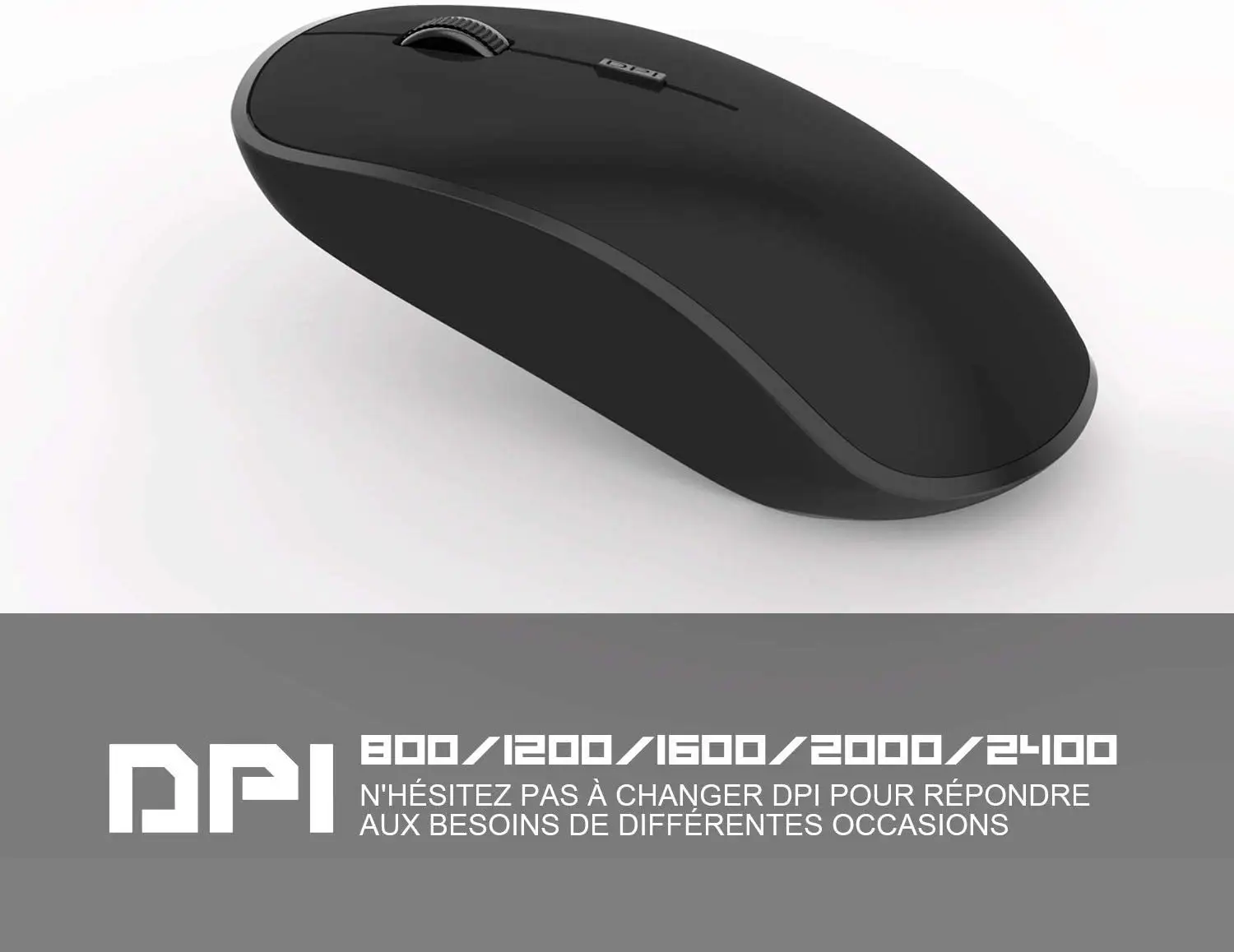 RATÓN DPI MULTIGRADO-El ratón Delgado inalámbrico tiene 5 niveles DPI ajustables (800/1200/1600/2000/2400); para que podamos elegir la velocidad correcta del cursor dependiendo de actividades como el trabajo, juegos o TV de diferente resolución o