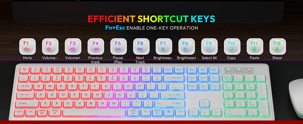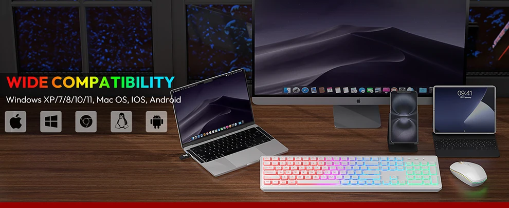 LUCES LED: Los colores del arco iris y el brillo ajustable crean un ambiente fresco y hacen que el teclado y el mouse esté lleno de energía.Además, los caracteres iluminados facilitan la escritura incluso en la oscuridad.NOTA: El teclado y el mouse comparten UN receptor USB.