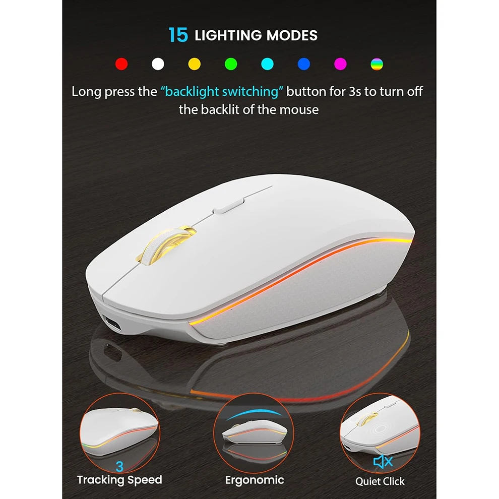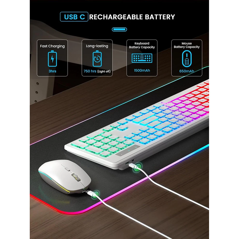 RECARGABLE Y DURADERO: Una carga para un rendimiento duradero.Espera del teclado inalámbrico: 365 días.El mouse inalámbrico en espera: 270 días.Para 9-5 trabajos, la batería del teclado dura al menos 4 semanas (luz de fondo apagada).