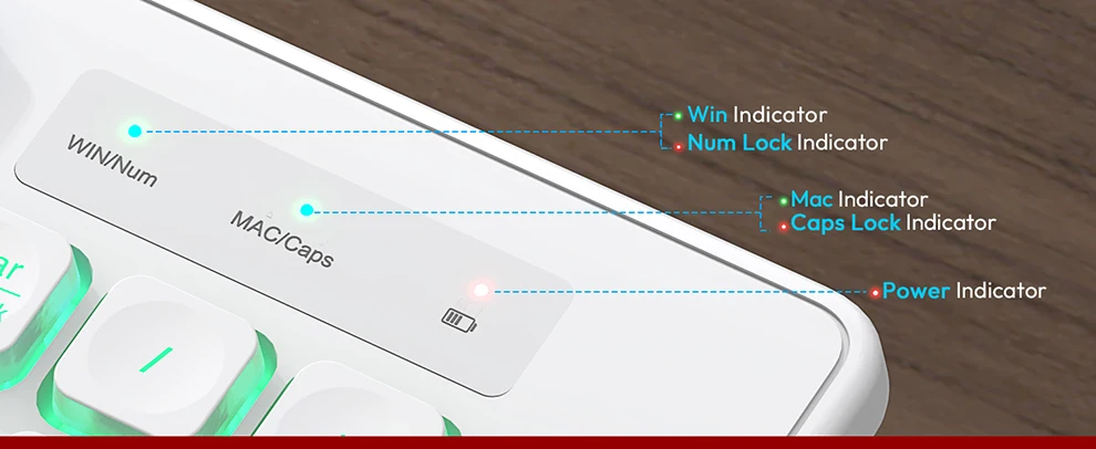 MODO DE DORMIR PARA AHORRAR ENERGÍA: El teclado duerme después de 30 minutos de inactividad, presione cualquier tecla para activarse. El ratón duerme después de 1,5 minutos, muévete o haz clic para despertar. Ambos vienen con un interruptor de ENCENDIDO/APAGADO. El indicador de energía parpadeará cuando la energía sea baja.