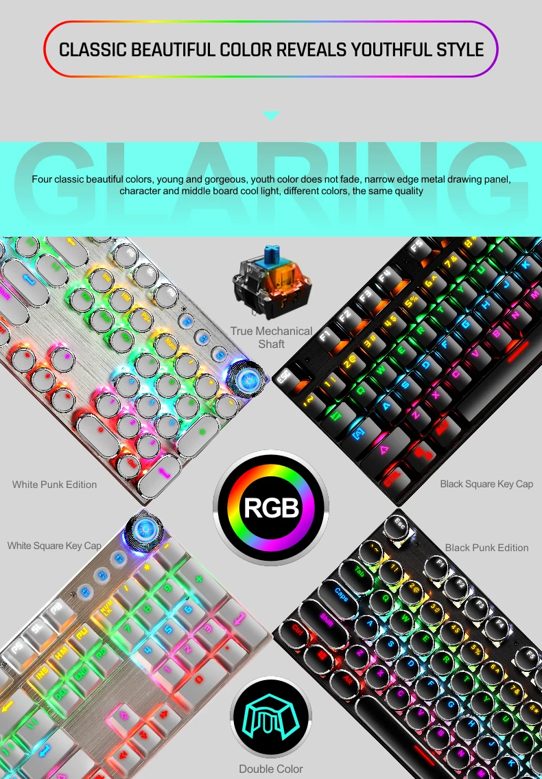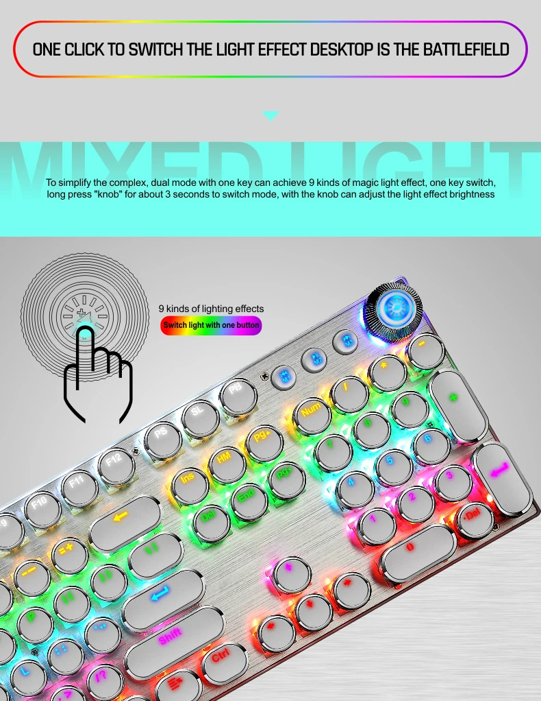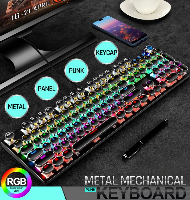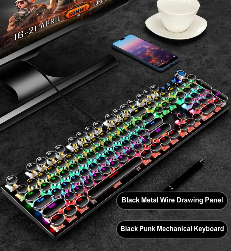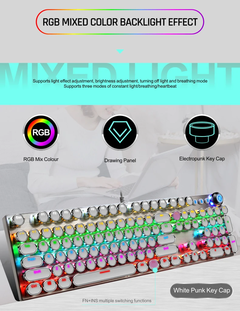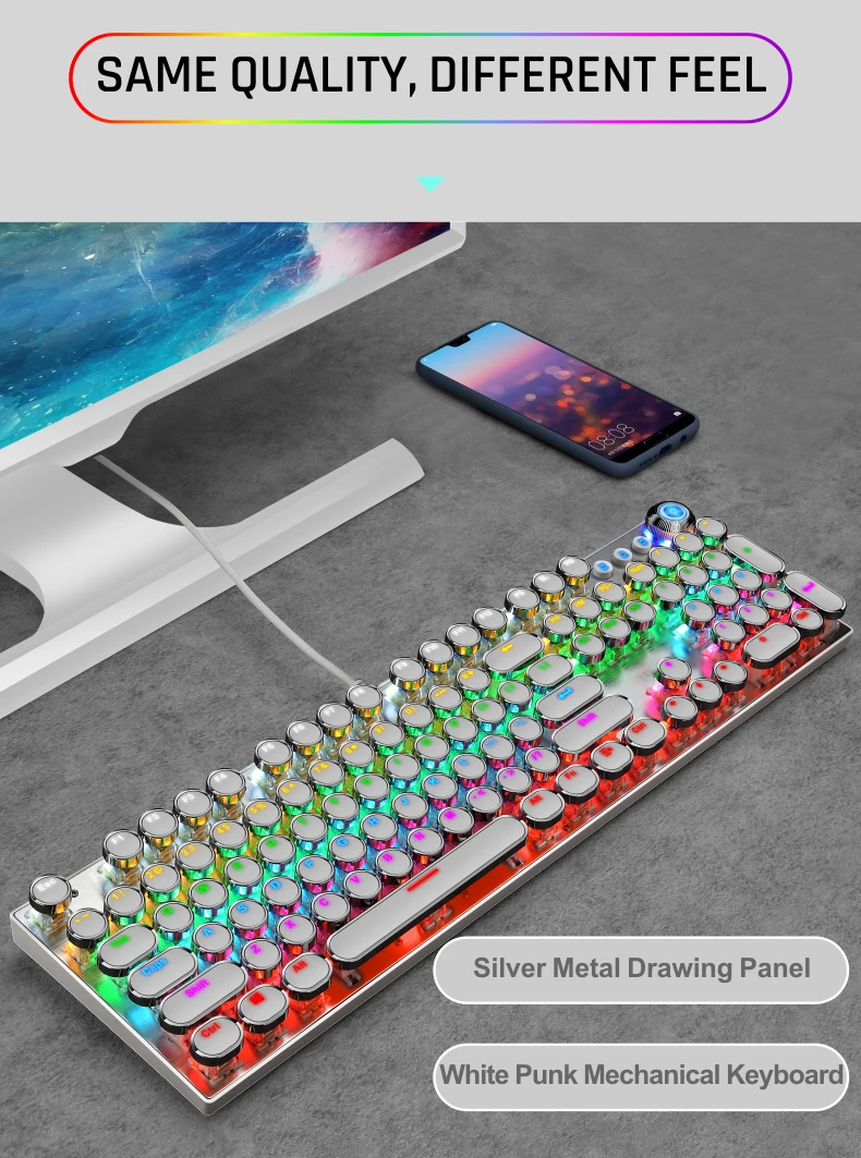 Teclado redondo Punk de 104 teclas con interruptor azul, teclado de ordenador blanco, Cable USB RGB con cable negro, Teclado mecánico para juegos 100% para PC