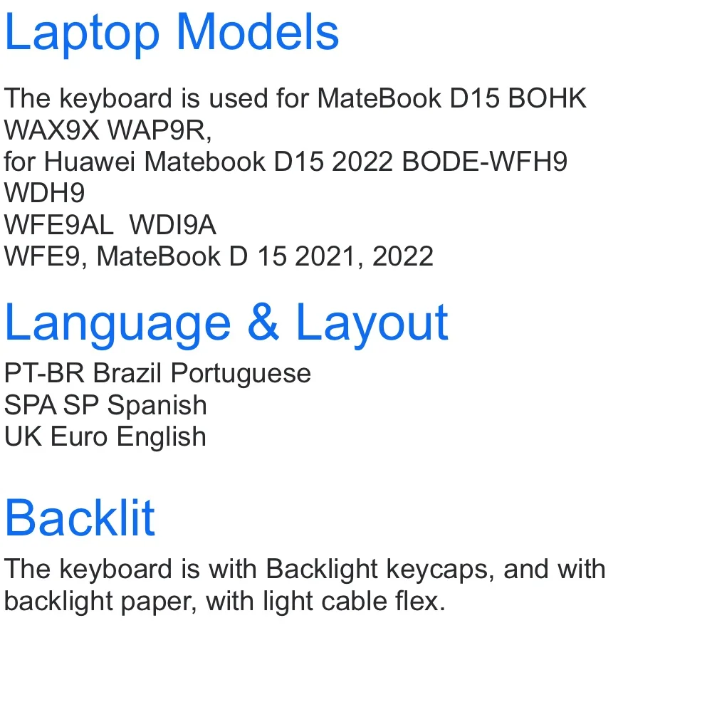 Teclado retroiluminado para Huawei MateBook D15 BOHK WAX9X WAP9R, 2022 2017 WDH9 WFE9AL WDI9A WFE9, teclados españoles UK Brasil