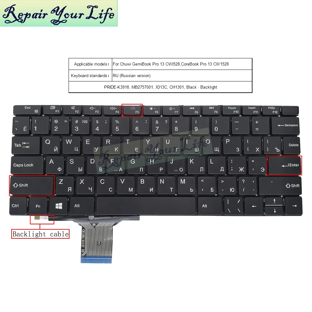 US Arabic Russian Backlit Laptop Keyboard for Chuwi GemiBook CWI528 CW1528 PRIDE-K3918 MB2757001 X313C CH1301 AR RU English