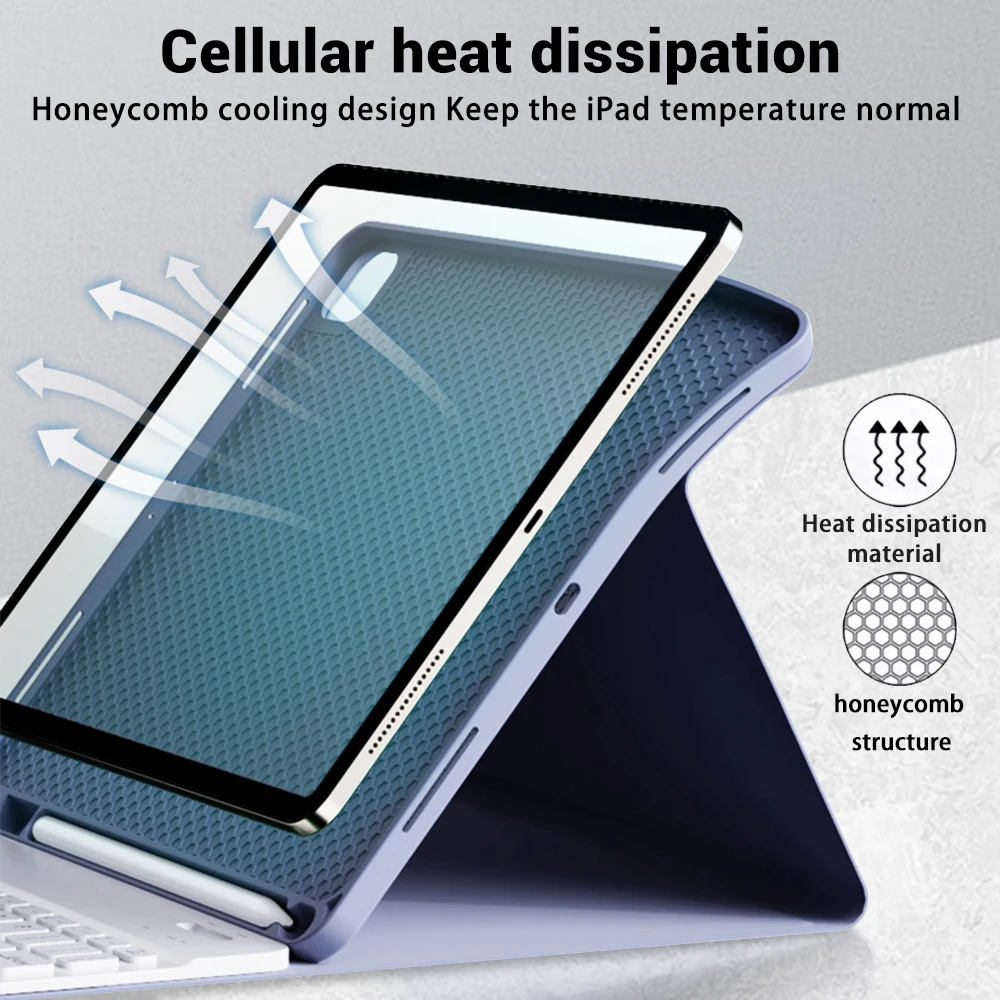 Tres ángulos de soporte para satisfacer las necesidades de todos en diferentes ángulos. El soporte es estable, no se soltará después de la fijación y la cubierta protectora tiene un imán magnético que puede sujetar firmemente el teclado sin caerse.Incluso si se lanza, no se caerá.La posición del teclado se puede ajustar según diferentes ángulos.