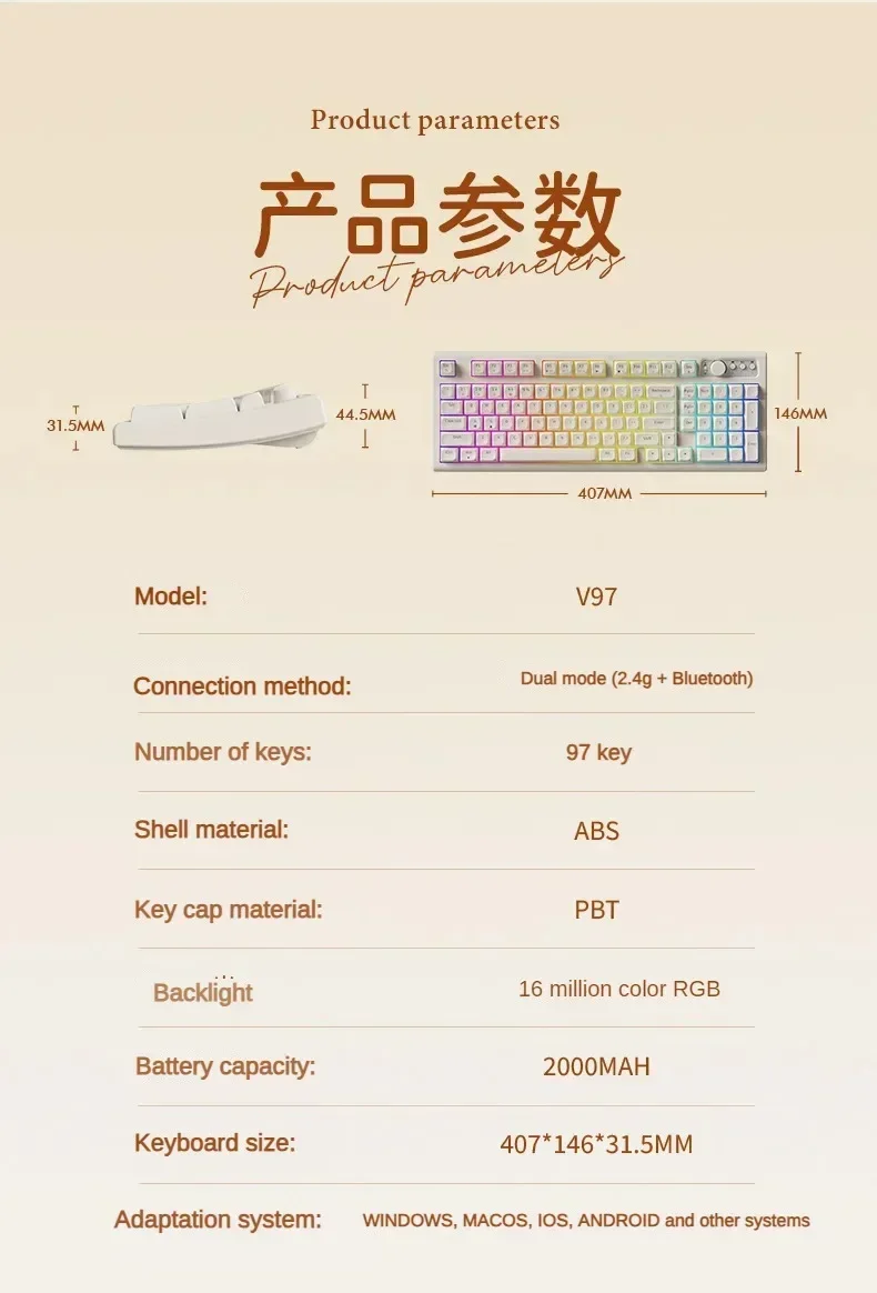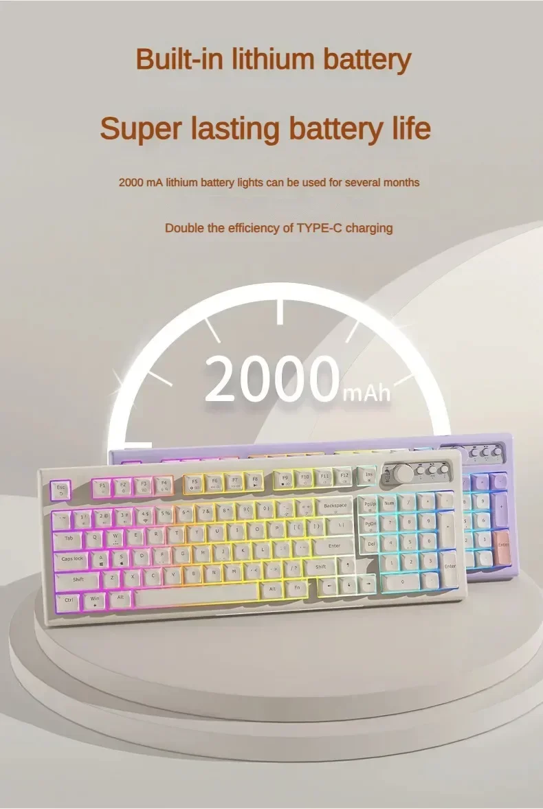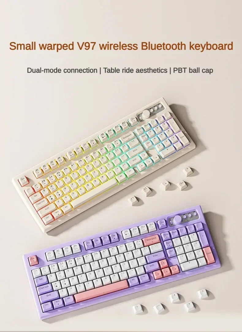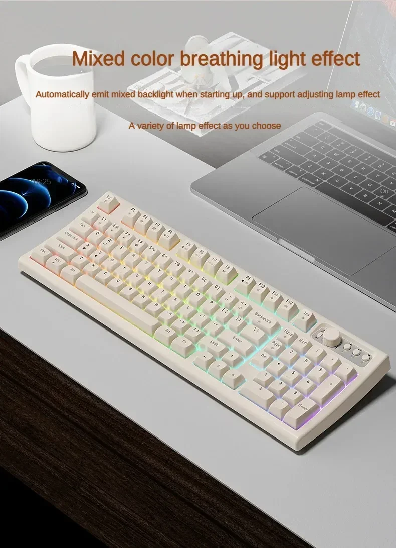 Eweadn V97 Teclado mecánico inalámbrico silencioso Diseño de 97 teclas Perilla multimedia retroiluminada RGB Teclado inalámbrico para juegos recargable