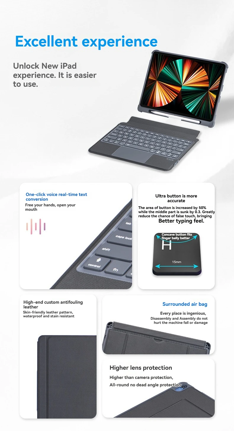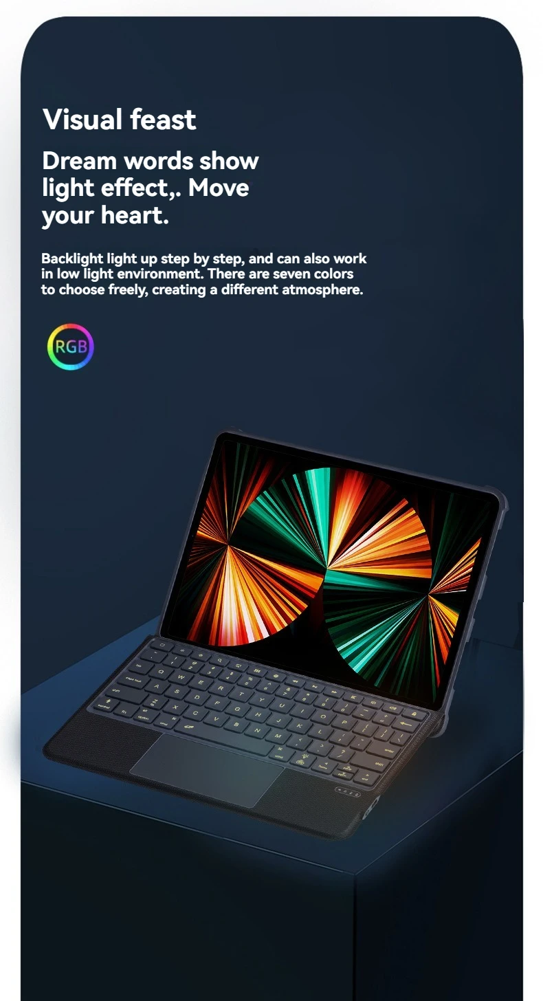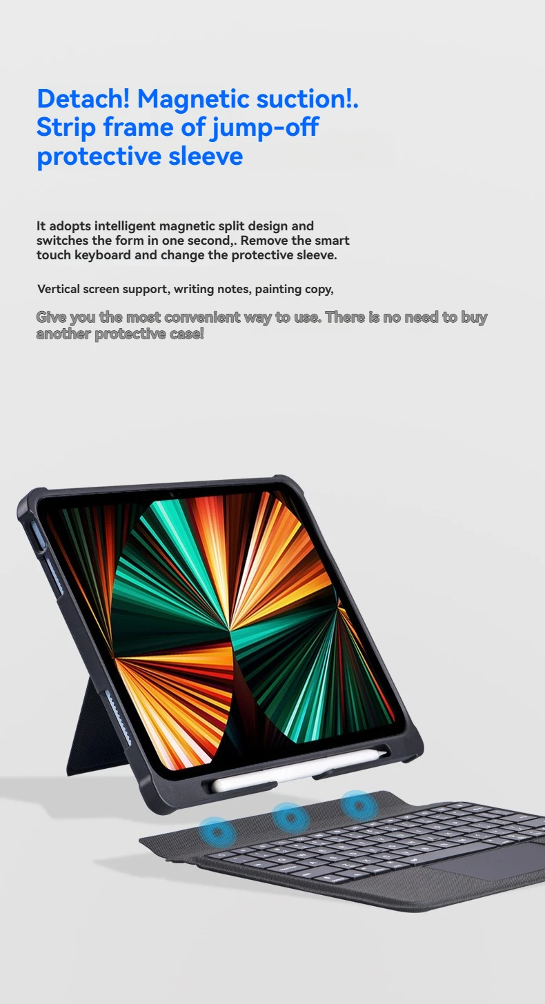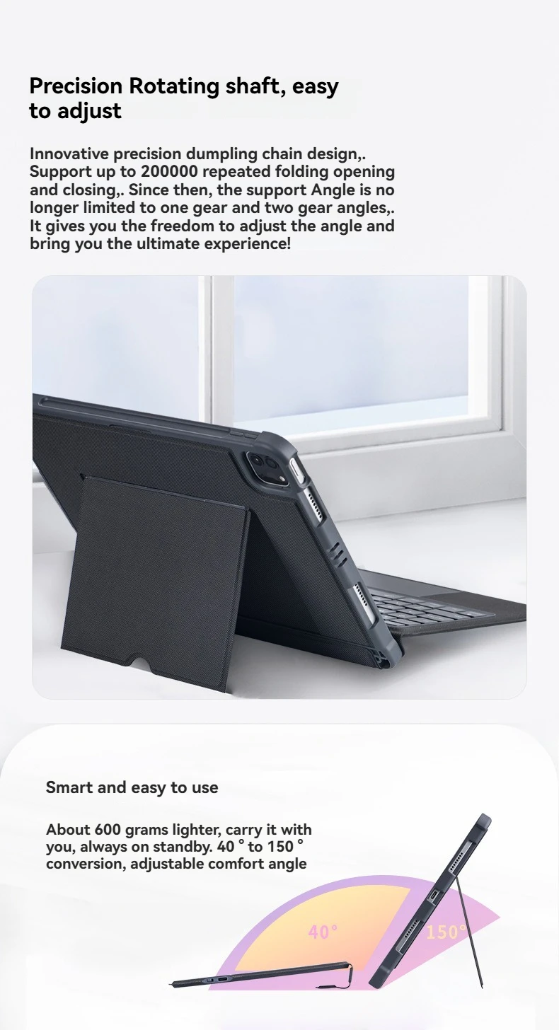 1.Oficina con pantalla horizontal, entretenimiento con pantalla vertical.La cubierta protectora del teclado táctil inteligente adopta un innovador diseño magnético inteligente dividido, con un soporte de múltiples ángulos que puede cambiar entre pantallas horizontales y verticales en un segundo, desbloqueando más escenarios de trabajo, entretenimiento y aprendizaje.