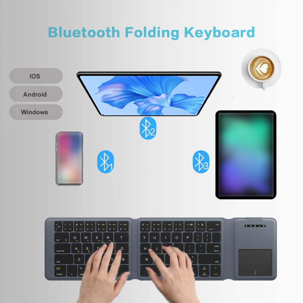 Comprar Teclado táctil inalámbrico Bluetooth triple plegable, teclado de viaje inalámbrico portátil recargable para PC/portátil/tableta-gris