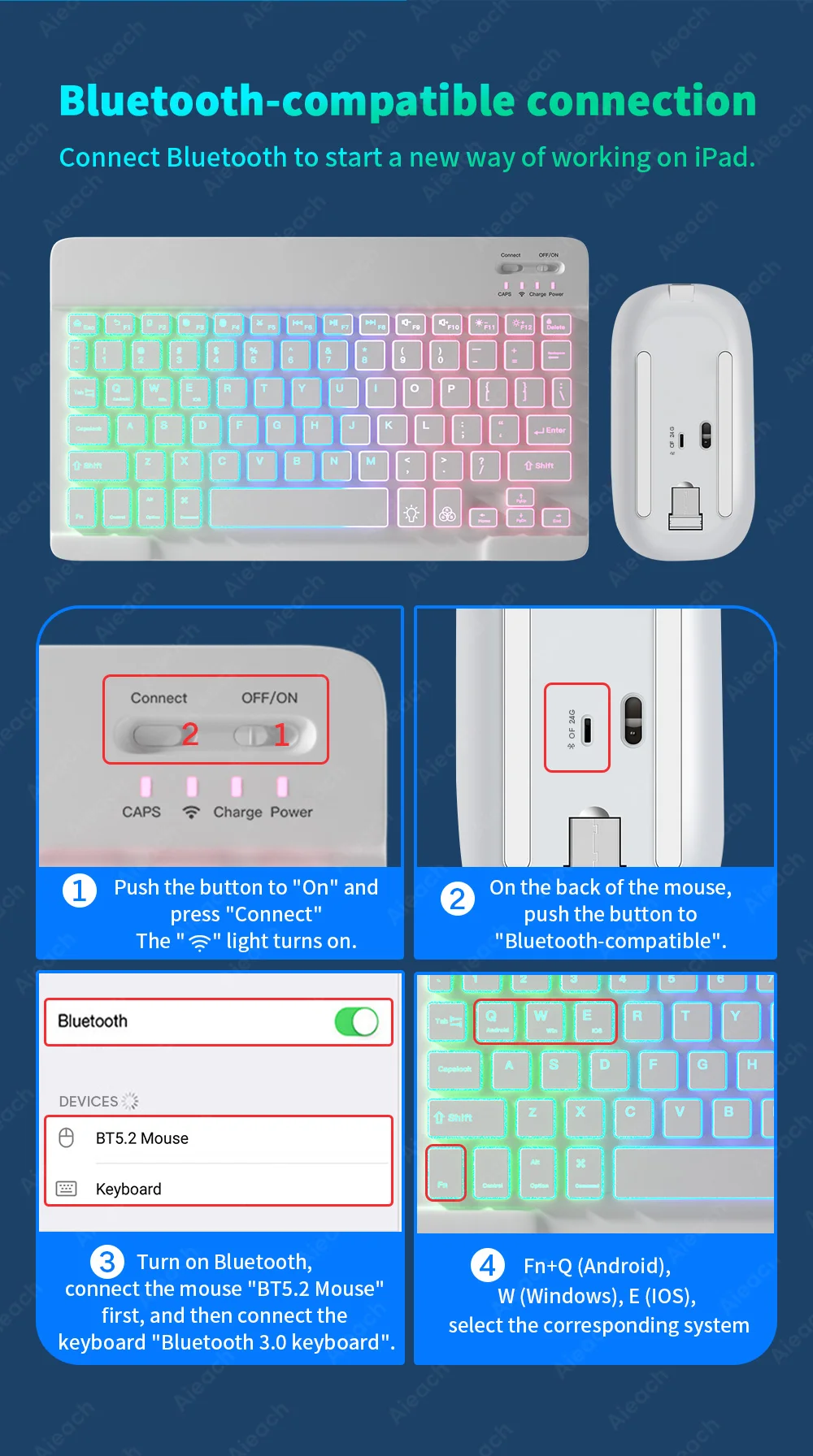 Teclado: presione el interruptor en la esquina superior derecha para "ON", presione "Conectar" y busque la conexión Bluetooth con "Teclado" en la lista de Bluetooth del dispositivo.