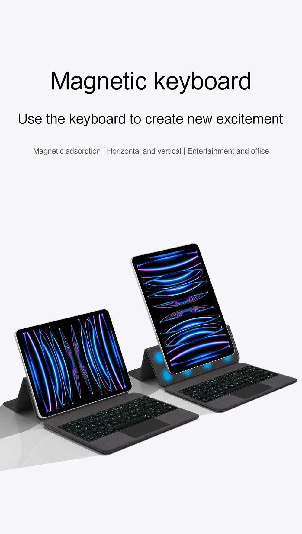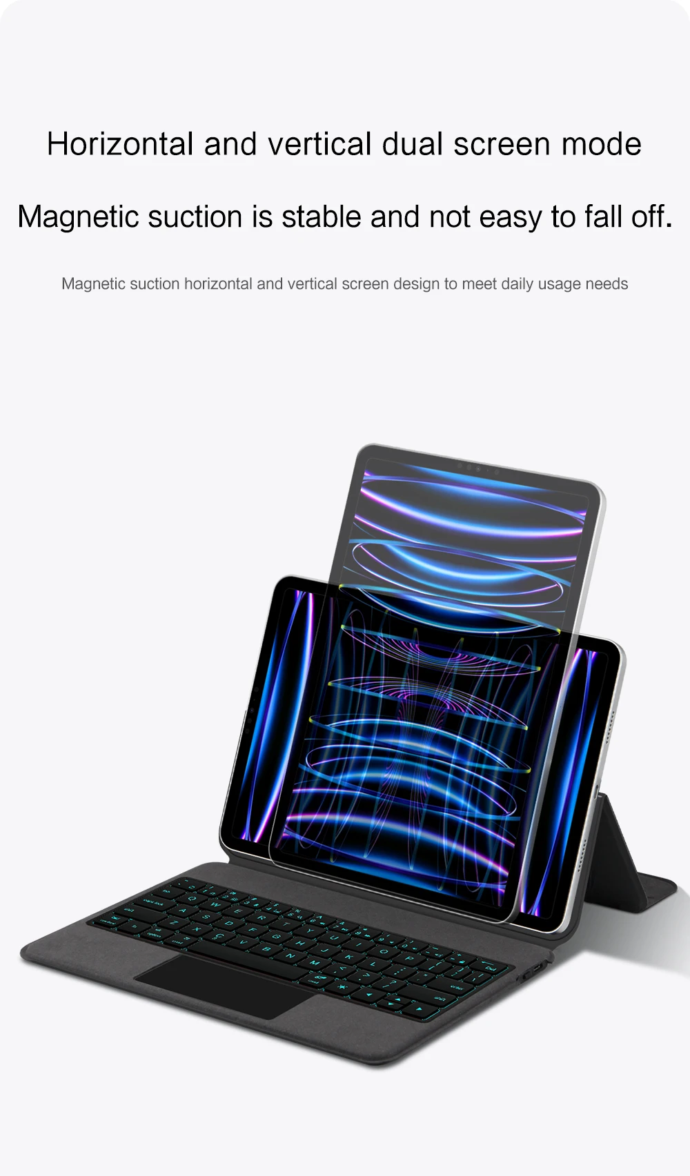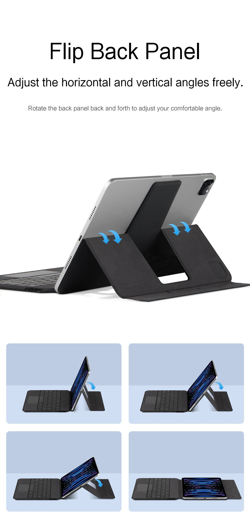 Este es un teclado magnético multifuncional "todo en uno".El iPad puede ser compatible horizontal y verticalmente, y la parte posterior del teclado está equipada con un soporte que puede ajustar el ángulo para satisfacer sus diferentes necesidades diarias.