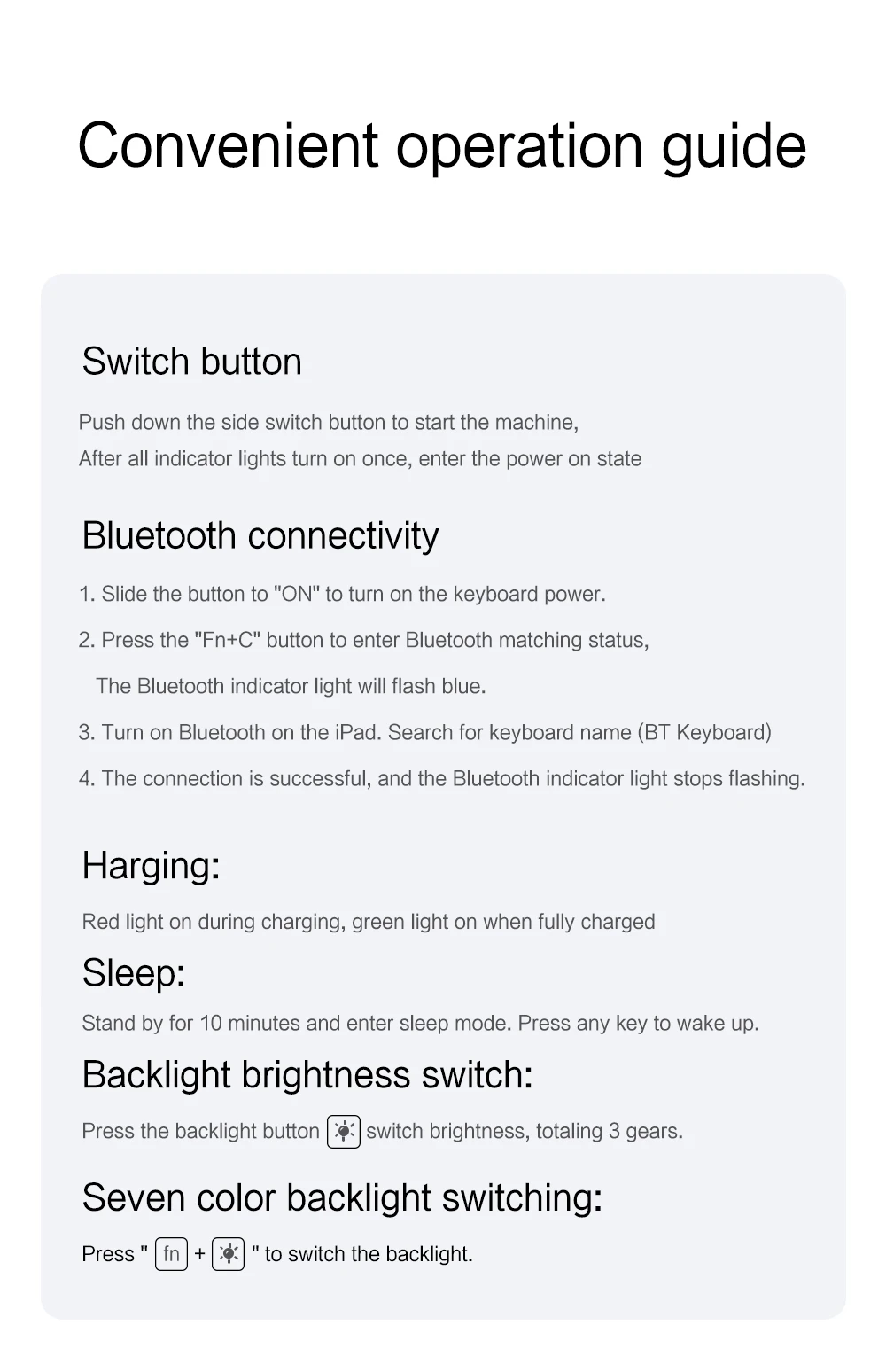 Nota 3:Después de abrir la alimentación, haga clic en "Fn" y "C" 【Fn+C】Botón juntos para abrir el Bluetooth del teclado.Es muy importante.