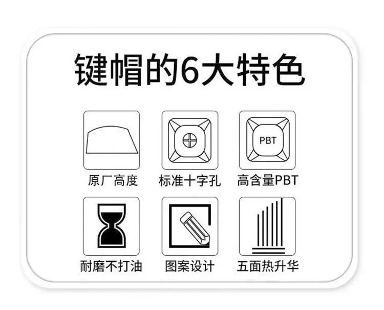 Material: PBT (superficie seca, textura clara, resistente a la corrosión, resistente al desgaste, no grasa, puede mantener las mejores condiciones durante mucho tiempo)