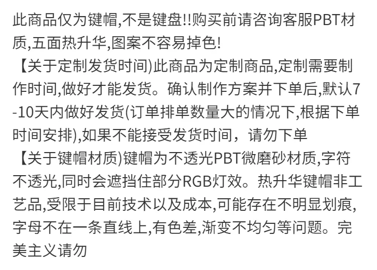 perfil keycap: chreeySensación táctil: tacto delicadoAmplia compatibilidad: solo se adapta a teclados y interruptores de teclado mecánicos para juegos 60/65/68con interruptores en forma de cruz. Contáctenos: Si tiene alguna pregunta, comuníquese con nosotros a tiempo. Le daremos las mejores soluciones y solucionesConsejos cálidos: este producto es un conjunto de teclas.Debido a las diferentes imágenes del monitor, puede haber diferencias de color.Si no está seguro de si es compatible, por favor contáctenosContenido del paquete: Lo comprobaremos cuidadosamente antes del envío para asegurarnos de que no tenga ningún problema.1 x juego de teclas