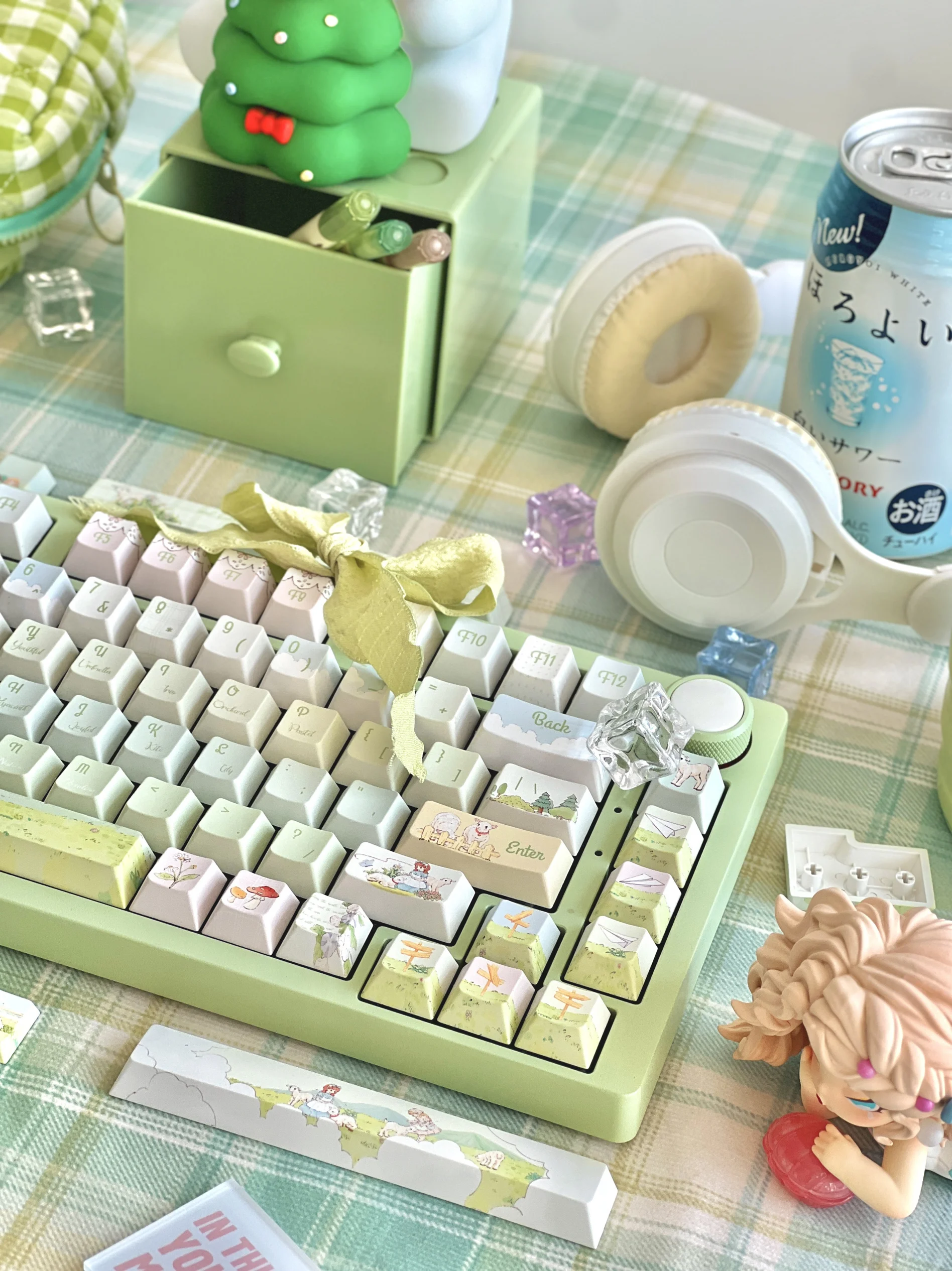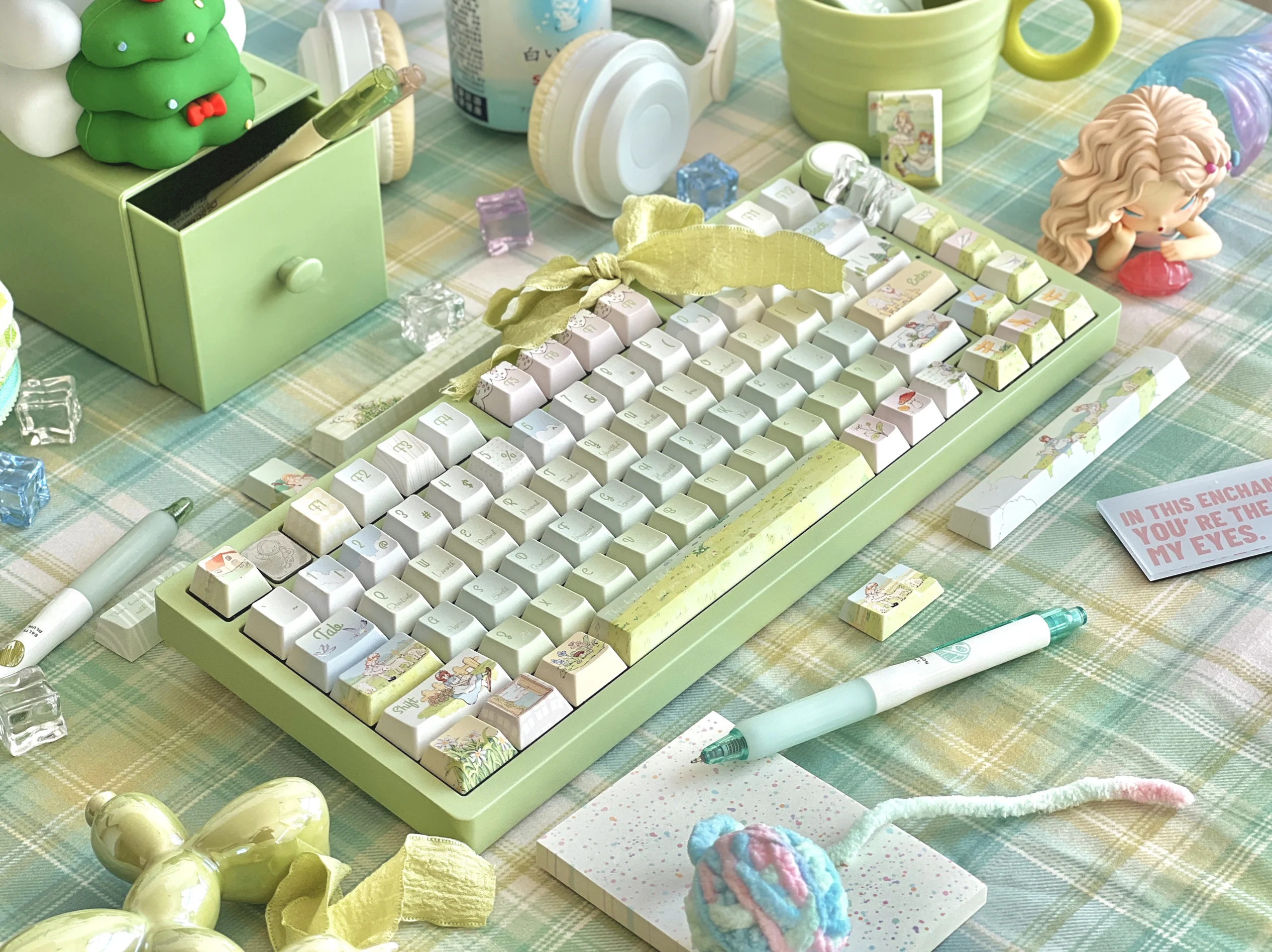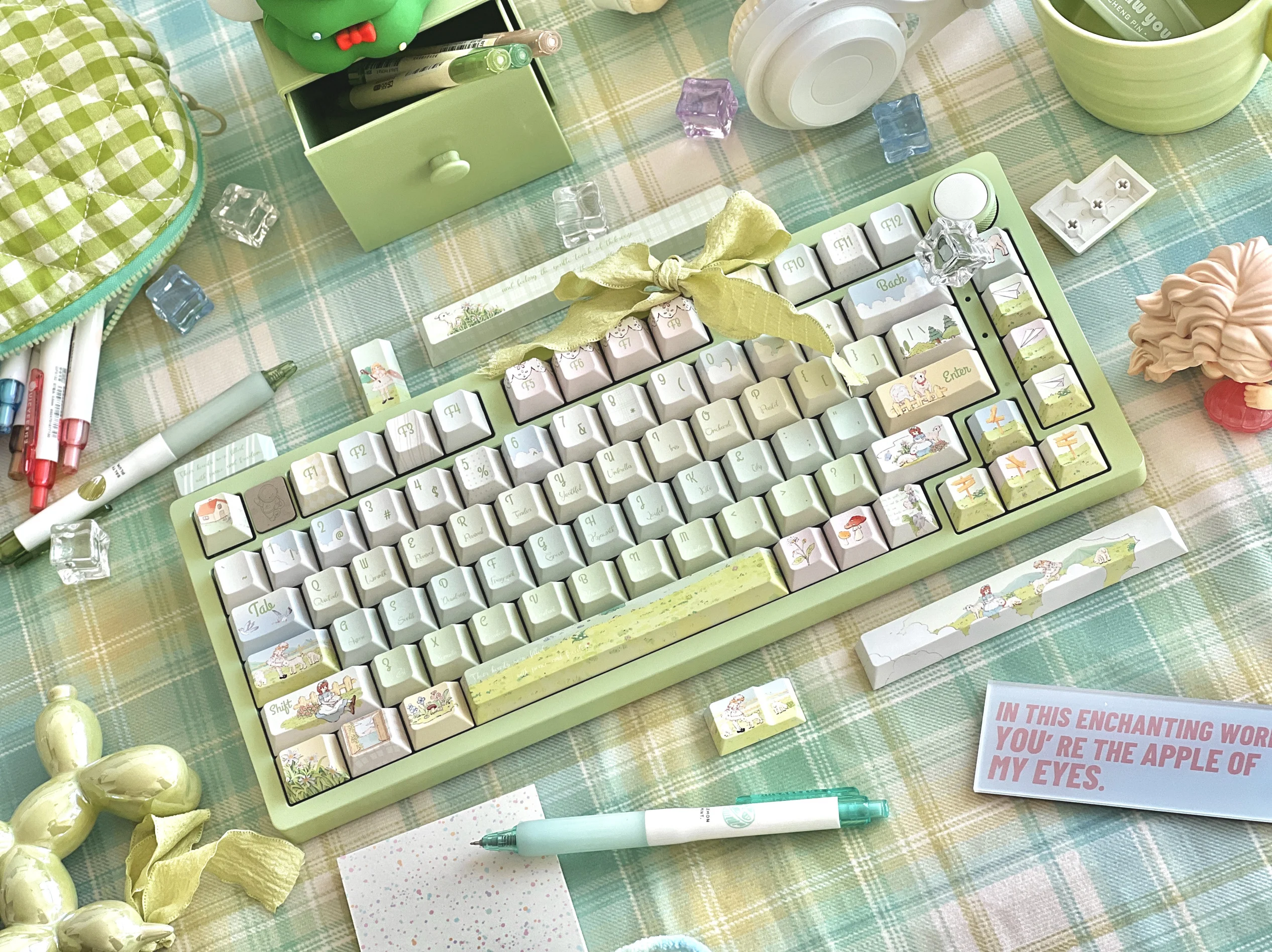 Teclas de campo de primavera de cuento de hadas, perfil de cereza, sublimación PBT, estilo rústico verde claro, teclas personalizadas para teclado mecánico